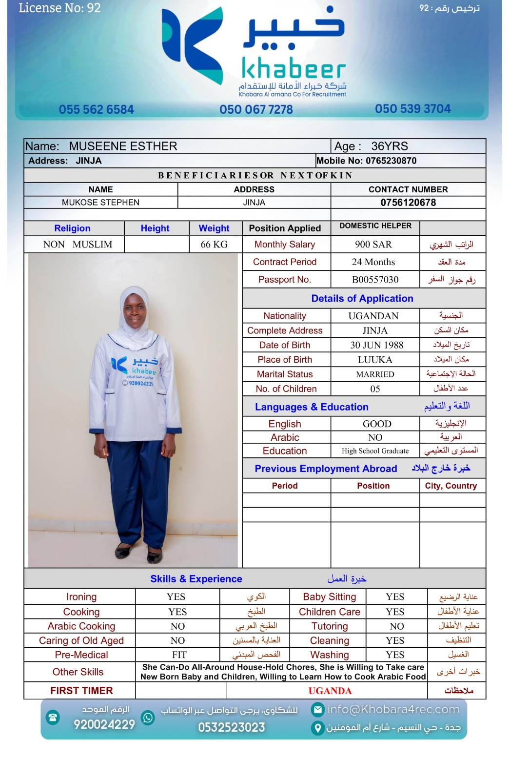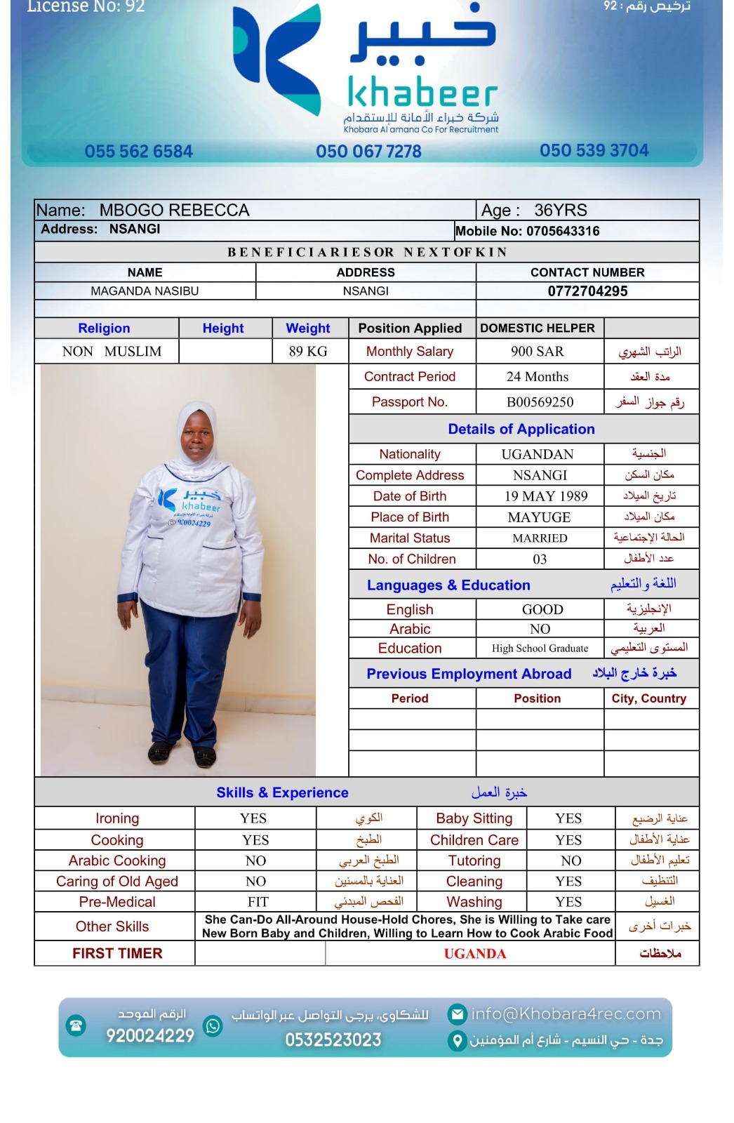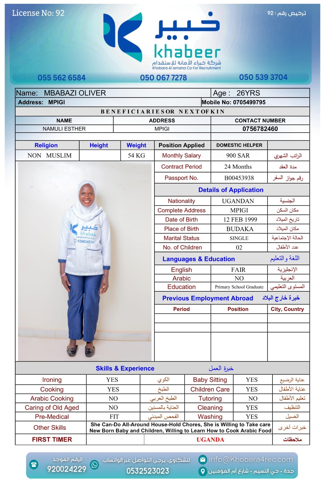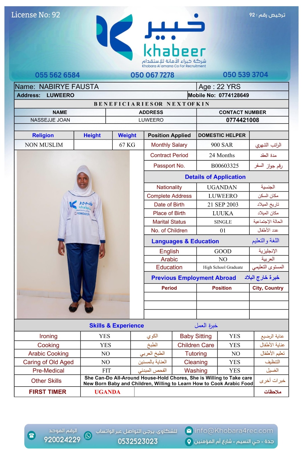 نوع الخدمة نوع الخدمة استقدام تأجير نقل خدمات الجنسية الجنسية الفلبين الهند بنغلاديش أوغندا اثيوبيا كينيا تنزانيا المهنة عاملة منزلية عاملة عناية سائق خاص الديانة مسلم غير مسلم الخبرة سبق العمل لم يسبق العمل العمر العمر 15 16 17 18 19 20 21 22 23 24 25 26 27 28 29 30 31 32 33 34 35 36 37 38 39 40 41 42 43 44 45 46 47 48 49 50 51 52 53 54 55 56 57 58 59 60 الحالة العائلية الحالة العائلية اعزب متزوج مطلق ارمل اللغة اللغة العربية العربية العربية بنجالي نبالي فلبيني امهرية سواحلي عربي + لغتها الاساسية اندونيسي اوغندي بروندي الوزن الوزن 40 41 42 43 44 45 46 47 48 49 50 51 52 53 54 55 56 57 58 59 60 61 62 63 64 65 66 67 68 69 70 71 72 73 74 75 76 77 78 79 80 81 82 83 84 85 86 87 88 89 90 91 92 93 94 95 96 97 98 99 100 الطول الطول 100 101 102 103 104 105 106 107 108 109 110 111 112 113 114 115 116 117 118 119 120 121 122 123 124 125 126 127 128 129 130 131 132 133 134 135 136 137 138 139 140 141 142 143 144 145 146 147 148 149 150 151 152 153 154 155 156 157 158 159 160 161 162 163 164 165 166 167 168 169 170 171 172 173 174 175 176 177 178 179 180 181 182 183 184 185 186 187 188 189 190 الطلبات الطلبات التنظيف الغسيل الكوي الطبيخ العربي عناية الأطفال عناية كبار السن عناية الرضيع تعليم الأطفال التنظيف - الغسيل - الكوي التنظيف - الغسيل - الكوي- رغبة في تعلم الطبخ التنظيف - الغسيل - الكوي- رغبة في العناية بالاطفال بحث مسح بحث متقدم NABIRYE FAUSTA أوغندا العمر 22 الخبرة لم يسبق العمل الديانة غير مسلم رقم الملف B00603325 حجز العاملة MWAGALE RECHEAL أوغندا العمر 34 الخبرة لم يسبق العمل الديانة غير مسلم رقم الملف B00610924 حجز العاملة MUSOKI LOICE أوغندا العمر 23 الخبرة لم يسبق العمل الديانة غير مسلم رقم الملف B00437910 حجز العاملة MUSEENE ESTHER أوغندا العمر 36 الخبرة لم يسبق العمل الديانة غير مسلم رقم الملف B00557030 حجز العاملة MUHINDO JULIET أوغندا العمر 30 الخبرة لم يسبق العمل الديانة غير مسلم رقم الملف B00469199 حجز العاملة MBOGO REBECCA كينيا العمر 36 الخبرة لم يسبق العمل الديانة غير مسلم رقم الملف B00569250 حجز العاملة MBABAZI OLIVER كينيا العمر 26 الخبرة لم يسبق العمل الديانة غير مسلم رقم الملف B00453938 حجز العاملة TERESIA SYONZIA MUNYOKI كينيا العمر 28 الخبرة سبق العمل الديانة مسلم رقم الملف AK1049384 حجز العاملة SOPHIA NYEVU العمر 36 الخبرة سبق العمل الديانة مسلم رقم الملف BK278057 حجز العاملة ELVINA KARISA العمر 22 الخبرة سبق العمل الديانة مسلم رقم الملف AK1699349 حجز العاملة 1 2 3 4 5 6