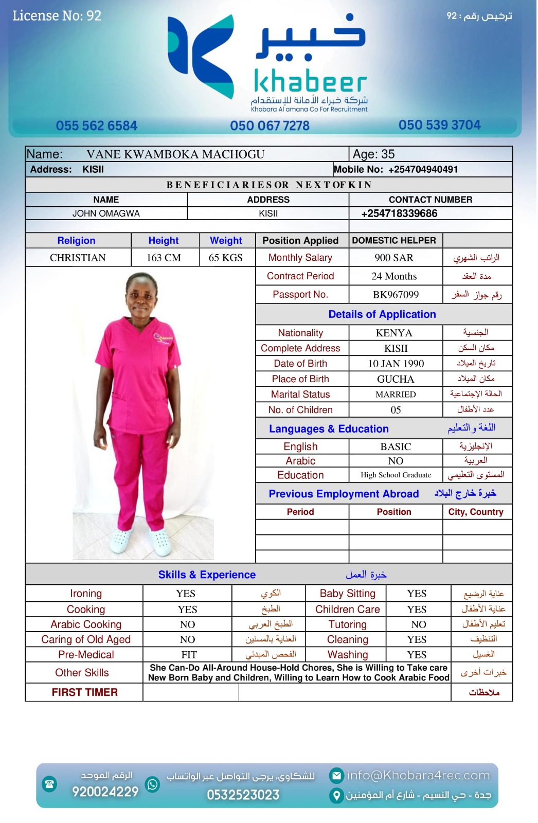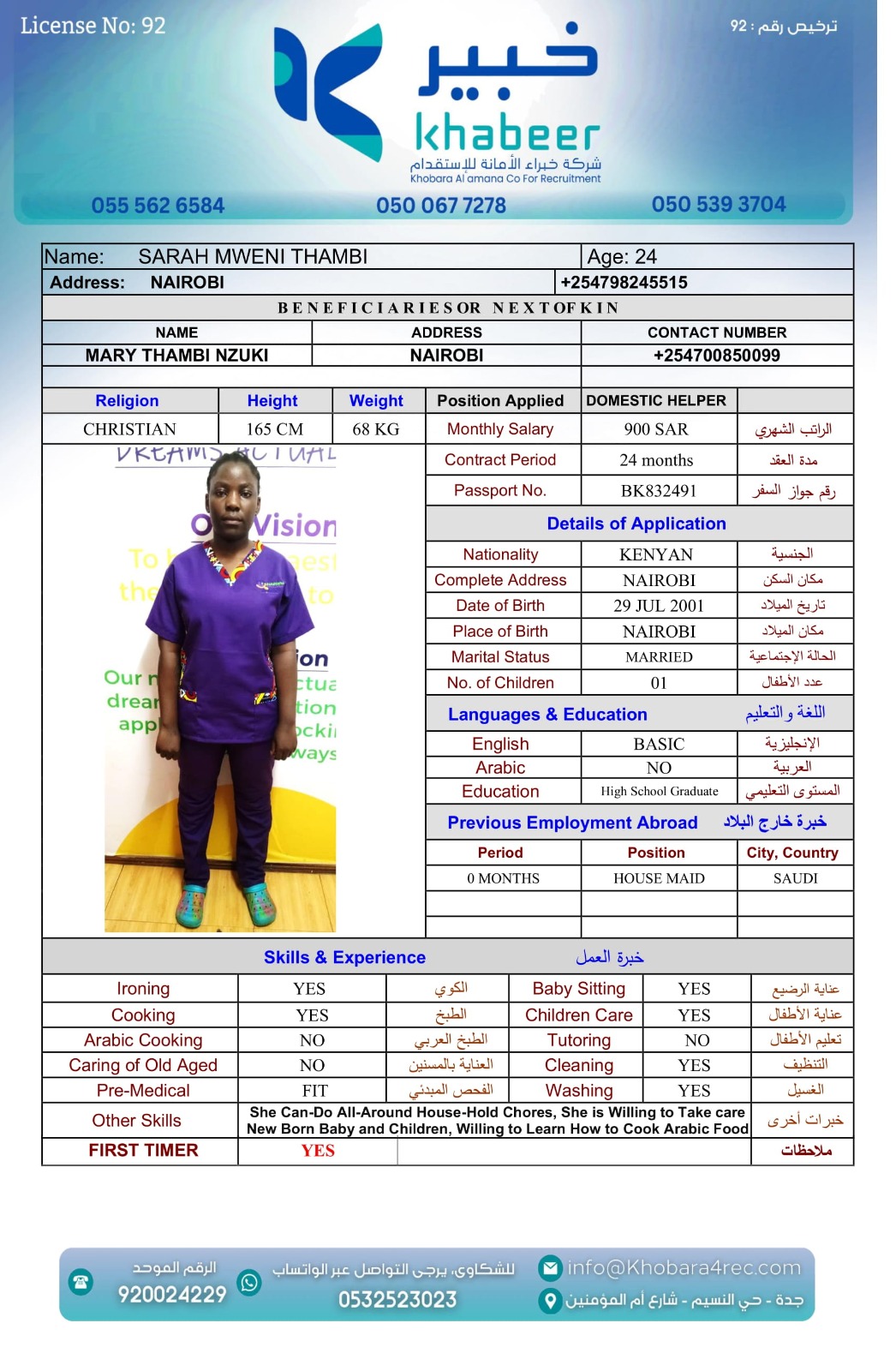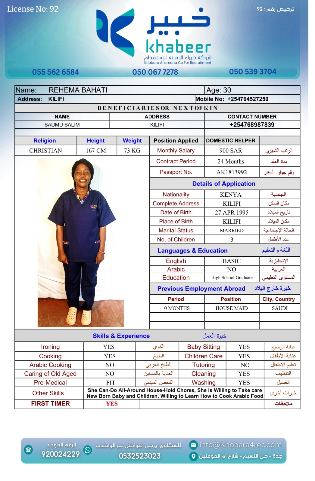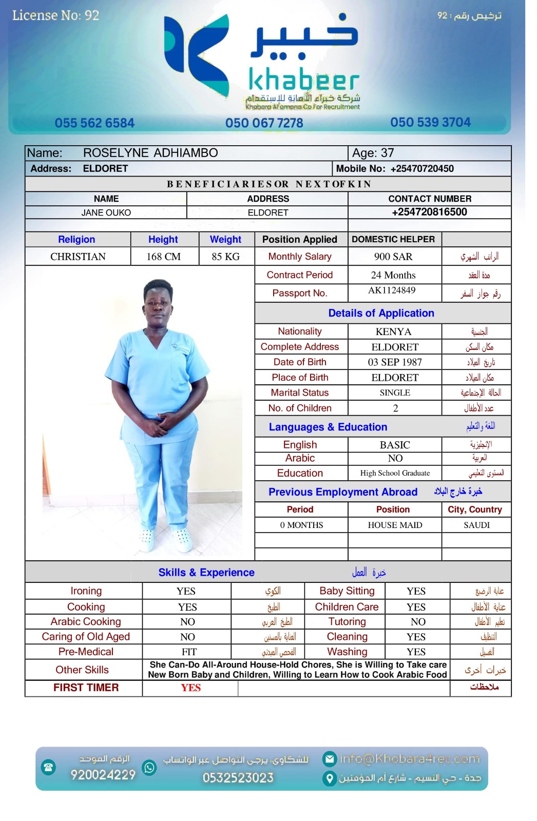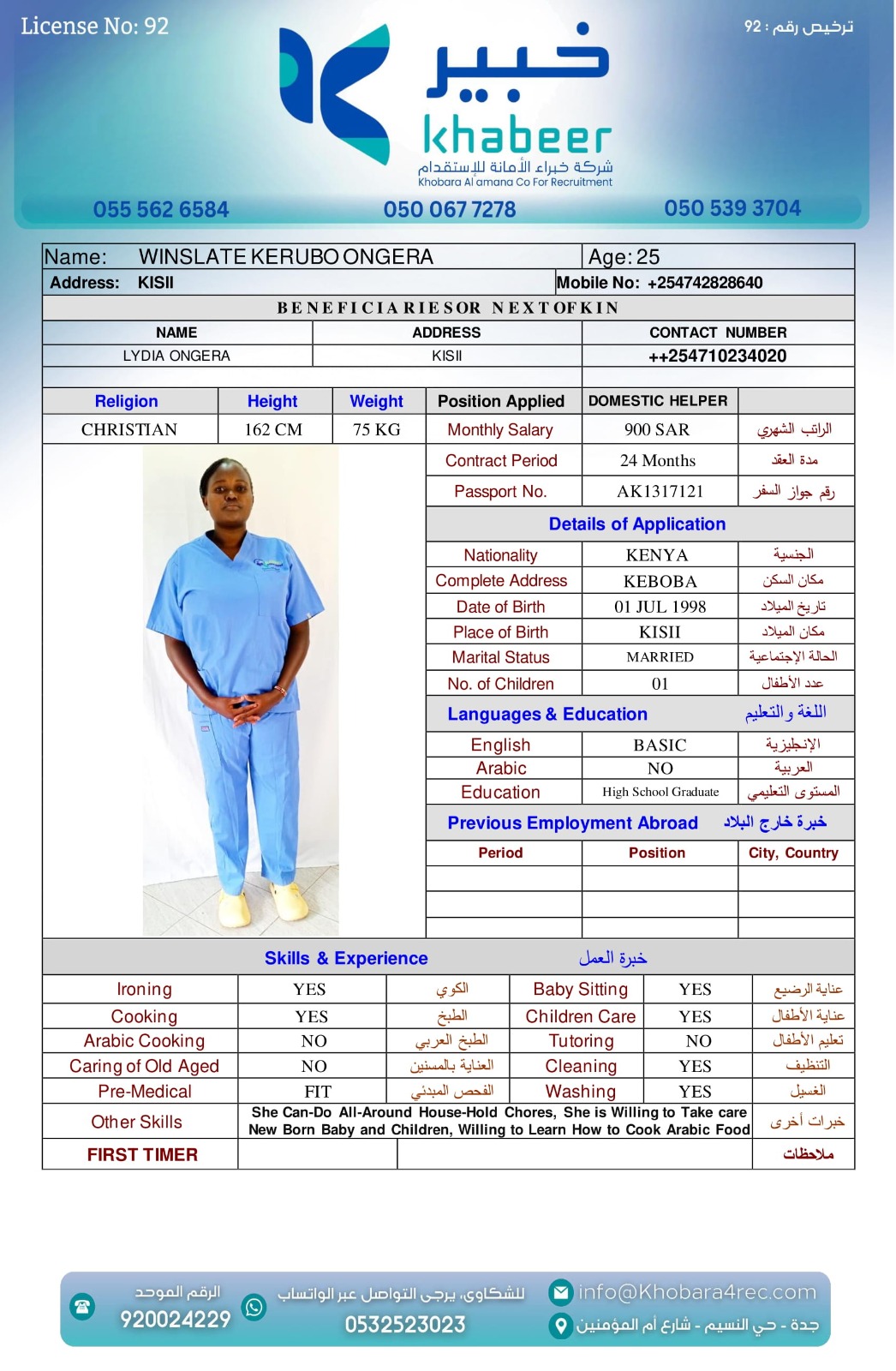نوع الخدمة نوع الخدمة استقدام تأجير نقل خدمات الجنسية الجنسية الفلبين الهند بنغلاديش أوغندا اثيوبيا كينيا تنزانيا المهنة عاملة منزلية عاملة عناية سائق خاص الديانة مسلم غير مسلم الخبرة سبق العمل لم يسبق العمل العمر العمر 15 16 17 18 19 20 21 22 23 24 25 26 27 28 29 30 31 32 33 34 35 36 37 38 39 40 41 42 43 44 45 46 47 48 49 50 51 52 53 54 55 56 57 58 59 60 الحالة العائلية الحالة العائلية اعزب متزوج مطلق ارمل اللغة اللغة العربية العربية العربية بنجالي نبالي فلبيني امهرية سواحلي عربي + لغتها الاساسية اندونيسي اوغندي بروندي الوزن الوزن 40 41 42 43 44 45 46 47 48 49 50 51 52 53 54 55 56 57 58 59 60 61 62 63 64 65 66 67 68 69 70 71 72 73 74 75 76 77 78 79 80 81 82 83 84 85 86 87 88 89 90 91 92 93 94 95 96 97 98 99 100 الطول الطول 100 101 102 103 104 105 106 107 108 109 110 111 112 113 114 115 116 117 118 119 120 121 122 123 124 125 126 127 128 129 130 131 132 133 134 135 136 137 138 139 140 141 142 143 144 145 146 147 148 149 150 151 152 153 154 155 156 157 158 159 160 161 162 163 164 165 166 167 168 169 170 171 172 173 174 175 176 177 178 179 180 181 182 183 184 185 186 187 188 189 190 الطلبات الطلبات التنظيف الغسيل الكوي الطبيخ العربي عناية الأطفال عناية كبار السن عناية الرضيع تعليم الأطفال التنظيف - الغسيل - الكوي التنظيف - الغسيل - الكوي- رغبة في تعلم الطبخ التنظيف - الغسيل - الكوي- رغبة في العناية بالاطفال بحث مسح بحث متقدم WINSLATEKERUBO كينيا العمر 25 الخبرة لم يسبق العمل الديانة غير مسلم رقم الملف AK1317121 حجز العاملة VICTORIA AMANI KENGA كينيا العمر 28 الخبرة لم يسبق العمل الديانة غير مسلم رقم الملف BK1037162 حجز العاملة SARAH MWENI THAMBI كينيا العمر 24 الخبرة لم يسبق العمل الديانة غير مسلم رقم الملف BK832491 حجز العاملة VANE KWAMBOKA MACHOGU كينيا العمر 35 الخبرة لم يسبق العمل الديانة غير مسلم رقم الملف BK967099 حجز العاملة RUTH WANJIRA WAMBUI كينيا العمر 22 الخبرة لم يسبق العمل الديانة مسلم رقم الملف BK931840 حجز العاملة ROSELYNE ADHIAMBO كينيا العمر 37 الخبرة لم يسبق العمل الديانة غير مسلم رقم الملف AK1124849 حجز العاملة REHEMA BAHATI كينيا العمر 30 الخبرة لم يسبق العمل الديانة غير مسلم رقم الملف AK1813992 حجز العاملة KYPKUSHABA ANNET أوغندا العمر 30 الخبرة لم يسبق العمل الديانة غير مسلم رقم الملف B00270910 حجز العاملة KASANA LYDIA أوغندا العمر 28 الخبرة لم يسبق العمل الديانة غير مسلم رقم الملف B00668411 حجز العاملة KAGOYA IRENE أوغندا العمر 23 الخبرة لم يسبق العمل الديانة غير مسلم رقم الملف B00478503 حجز العاملة 1 2 3 4 5 6 7 8