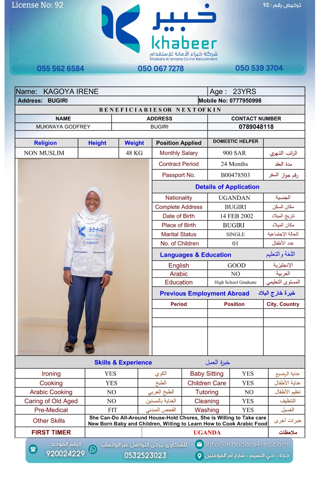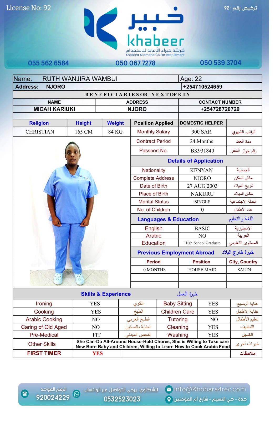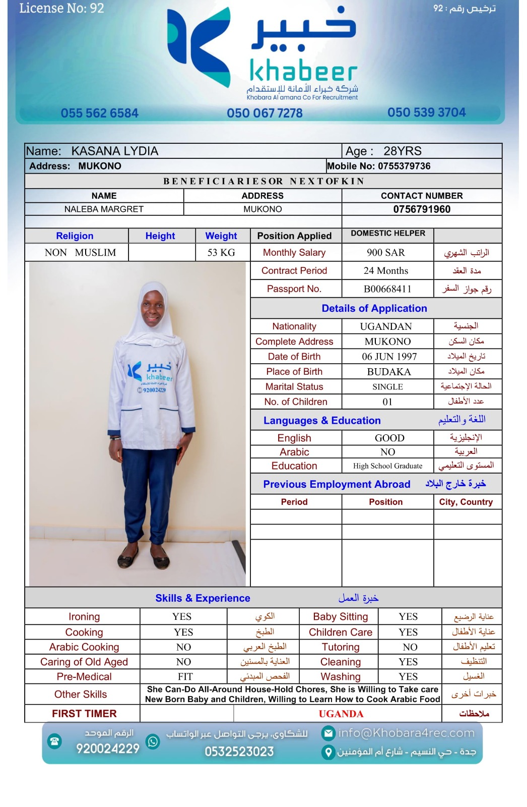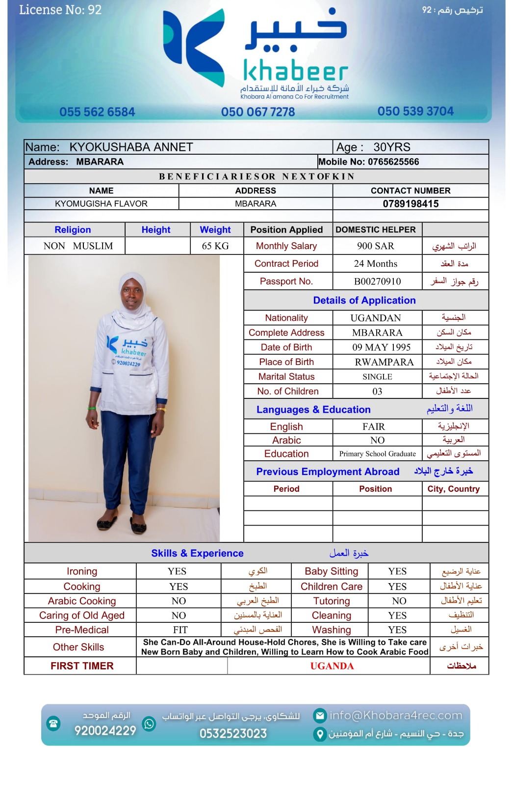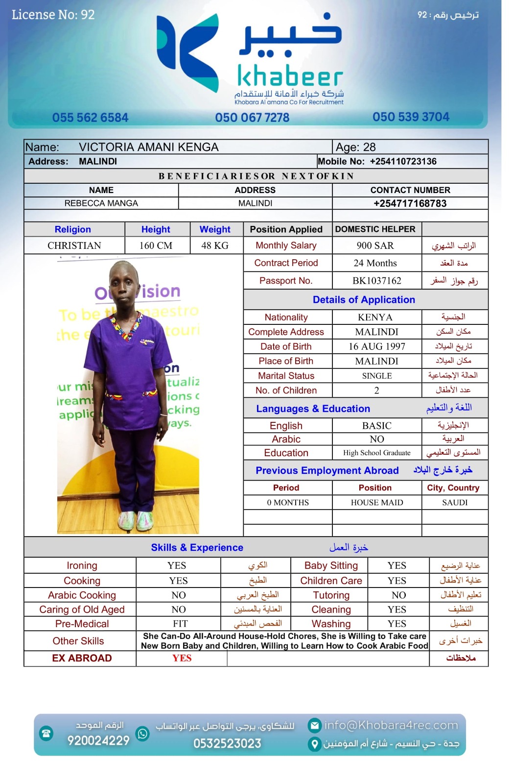 نوع الخدمة نوع الخدمة استقدام تأجير نقل خدمات الجنسية الجنسية الفلبين الهند بنغلاديش أوغندا اثيوبيا كينيا تنزانيا المهنة عاملة منزلية عاملة عناية سائق خاص الديانة مسلم غير مسلم الخبرة سبق العمل لم يسبق العمل العمر العمر 15 16 17 18 19 20 21 22 23 24 25 26 27 28 29 30 31 32 33 34 35 36 37 38 39 40 41 42 43 44 45 46 47 48 49 50 51 52 53 54 55 56 57 58 59 60 الحالة العائلية الحالة العائلية اعزب متزوج مطلق ارمل اللغة اللغة العربية العربية العربية بنجالي نبالي فلبيني امهرية سواحلي عربي + لغتها الاساسية اندونيسي اوغندي بروندي الوزن الوزن 40 41 42 43 44 45 46 47 48 49 50 51 52 53 54 55 56 57 58 59 60 61 62 63 64 65 66 67 68 69 70 71 72 73 74 75 76 77 78 79 80 81 82 83 84 85 86 87 88 89 90 91 92 93 94 95 96 97 98 99 100 الطول الطول 100 101 102 103 104 105 106 107 108 109 110 111 112 113 114 115 116 117 118 119 120 121 122 123 124 125 126 127 128 129 130 131 132 133 134 135 136 137 138 139 140 141 142 143 144 145 146 147 148 149 150 151 152 153 154 155 156 157 158 159 160 161 162 163 164 165 166 167 168 169 170 171 172 173 174 175 176 177 178 179 180 181 182 183 184 185 186 187 188 189 190 الطلبات الطلبات التنظيف الغسيل الكوي الطبيخ العربي عناية الأطفال عناية كبار السن عناية الرضيع تعليم الأطفال التنظيف - الغسيل - الكوي التنظيف - الغسيل - الكوي- رغبة في تعلم الطبخ التنظيف - الغسيل - الكوي- رغبة في العناية بالاطفال بحث مسح بحث متقدم WINSLATEKERUBO كينيا العمر 25 الخبرة لم يسبق العمل الديانة غير مسلم رقم الملف AK1317121 حجز العاملة VICTORIA AMANI KENGA كينيا العمر 28 الخبرة لم يسبق العمل الديانة غير مسلم رقم الملف BK1037162 حجز العاملة SARAH MWENI THAMBI كينيا العمر 24 الخبرة لم يسبق العمل الديانة غير مسلم رقم الملف BK832491 حجز العاملة VANE KWAMBOKA MACHOGU كينيا العمر 35 الخبرة لم يسبق العمل الديانة غير مسلم رقم الملف BK967099 حجز العاملة RUTH WANJIRA WAMBUI كينيا العمر 22 الخبرة لم يسبق العمل الديانة مسلم رقم الملف BK931840 حجز العاملة ROSELYNE ADHIAMBO كينيا العمر 37 الخبرة لم يسبق العمل الديانة غير مسلم رقم الملف AK1124849 حجز العاملة REHEMA BAHATI كينيا العمر 30 الخبرة لم يسبق العمل الديانة غير مسلم رقم الملف AK1813992 حجز العاملة KYPKUSHABA ANNET أوغندا العمر 30 الخبرة لم يسبق العمل الديانة غير مسلم رقم الملف B00270910 حجز العاملة KASANA LYDIA أوغندا العمر 28 الخبرة لم يسبق العمل الديانة غير مسلم رقم الملف B00668411 حجز العاملة KAGOYA IRENE أوغندا العمر 23 الخبرة لم يسبق العمل الديانة غير مسلم رقم الملف B00478503 حجز العاملة 1 2 3 4 5 6 7 8