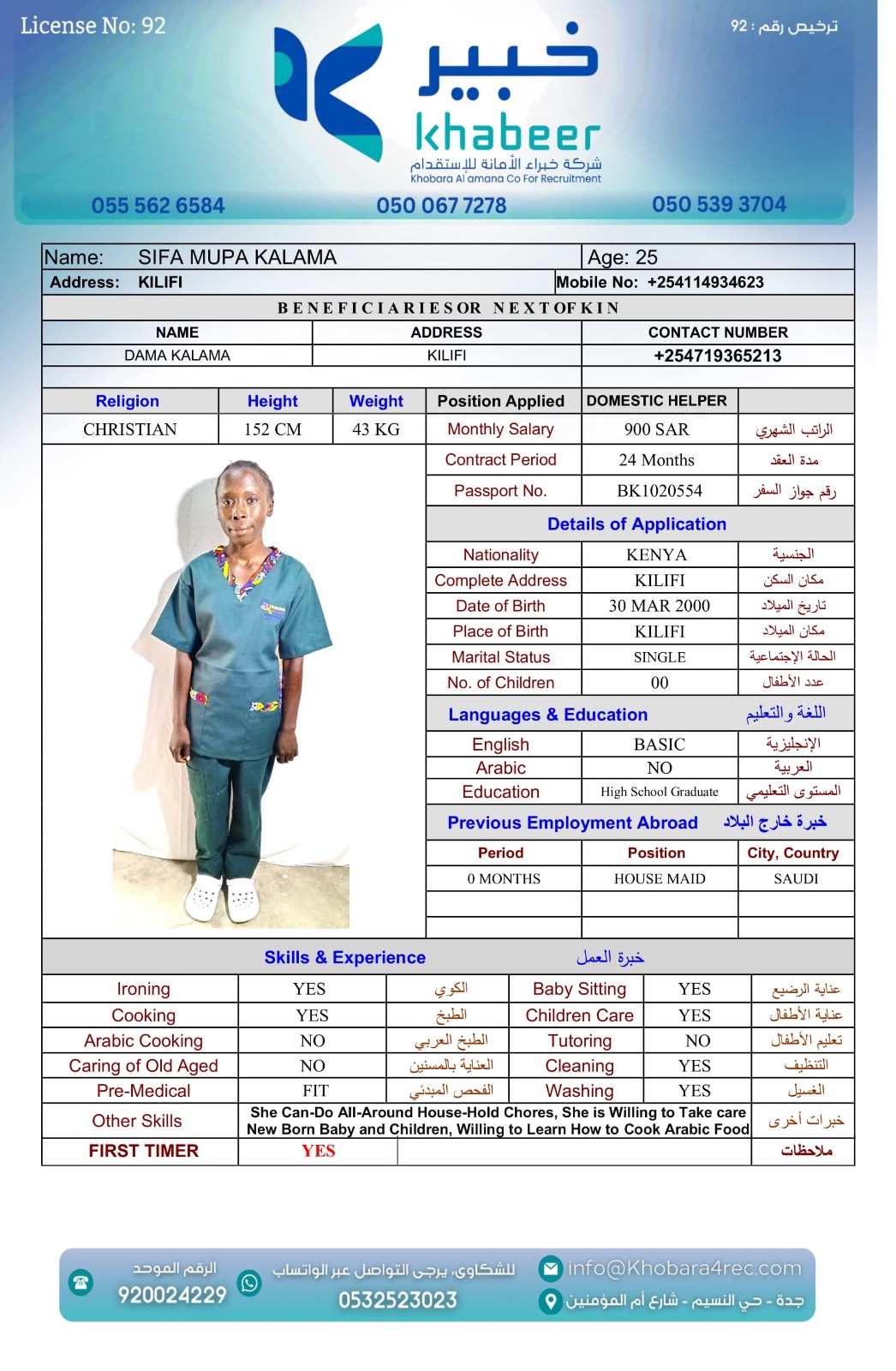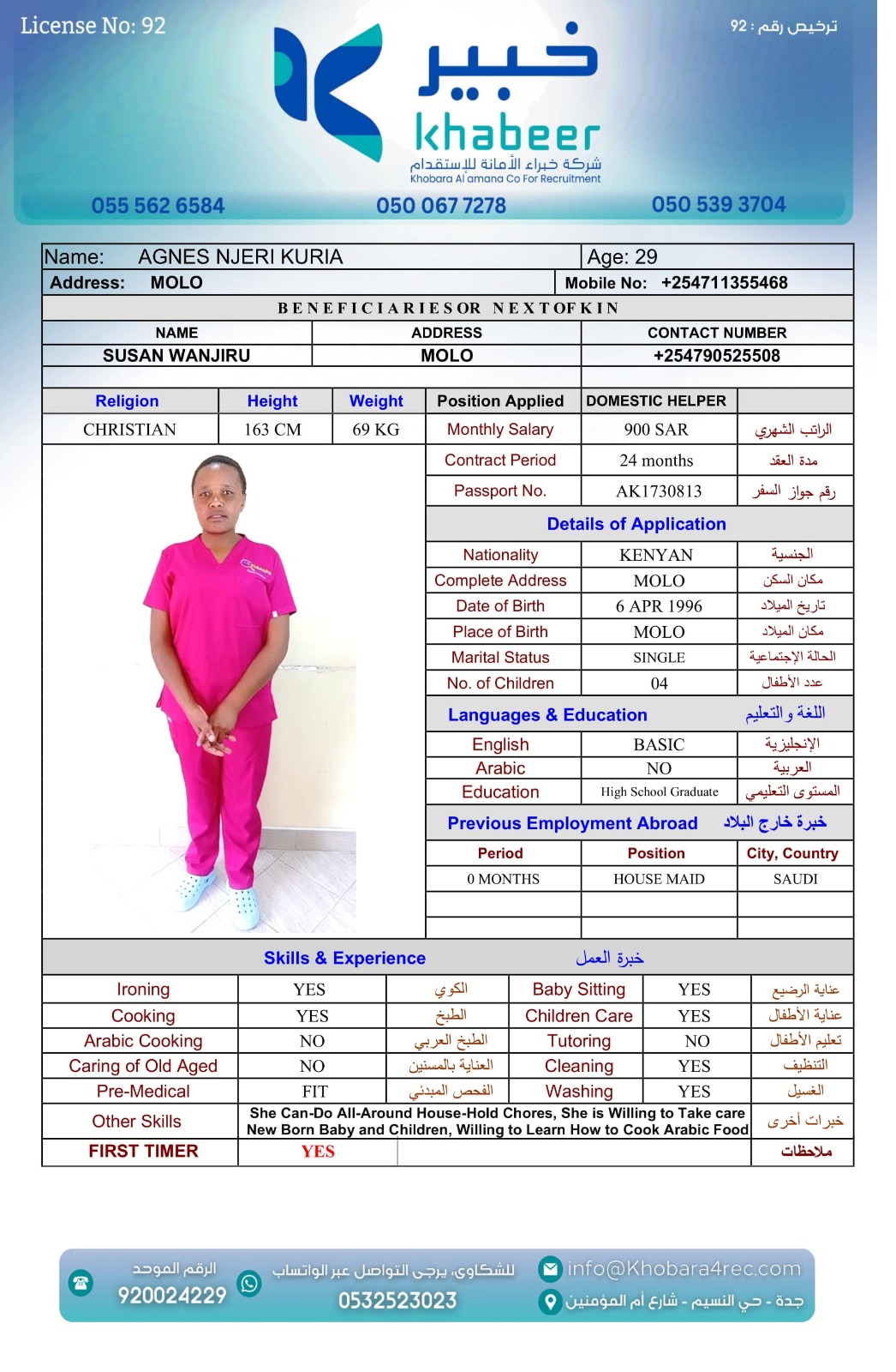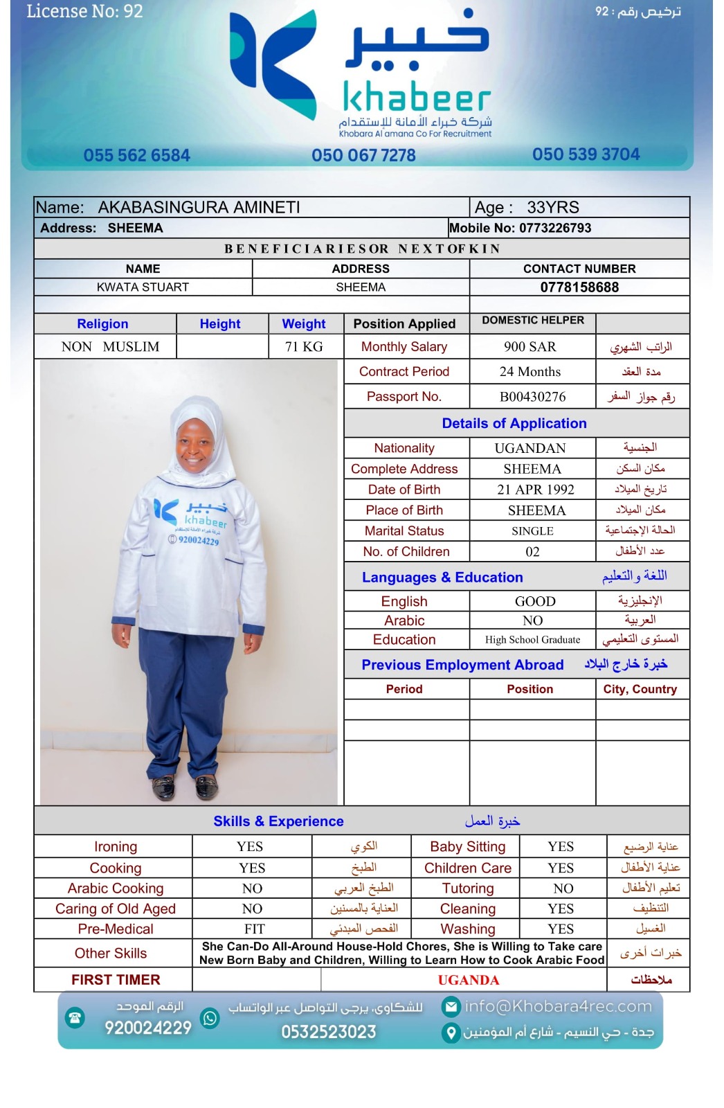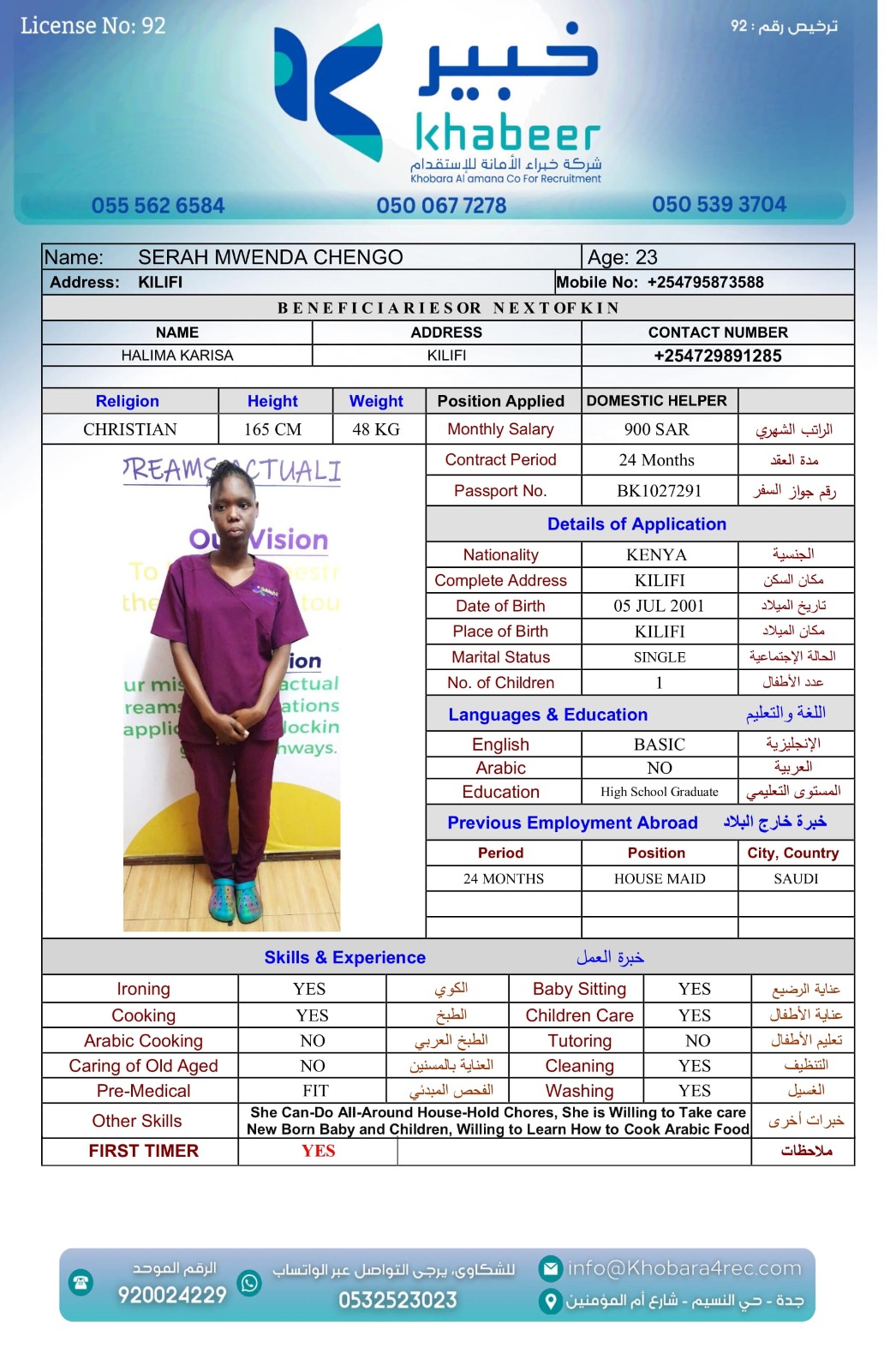 نوع الخدمة نوع الخدمة استقدام تأجير نقل خدمات الجنسية الجنسية الفلبين الهند بنغلاديش أوغندا اثيوبيا كينيا تنزانيا المهنة عاملة منزلية عاملة عناية سائق خاص الديانة مسلم غير مسلم الخبرة سبق العمل لم يسبق العمل العمر العمر 15 16 17 18 19 20 21 22 23 24 25 26 27 28 29 30 31 32 33 34 35 36 37 38 39 40 41 42 43 44 45 46 47 48 49 50 51 52 53 54 55 56 57 58 59 60 الحالة العائلية الحالة العائلية اعزب متزوج مطلق ارمل اللغة اللغة العربية العربية العربية بنجالي نبالي فلبيني امهرية سواحلي عربي + لغتها الاساسية اندونيسي اوغندي بروندي الوزن الوزن 40 41 42 43 44 45 46 47 48 49 50 51 52 53 54 55 56 57 58 59 60 61 62 63 64 65 66 67 68 69 70 71 72 73 74 75 76 77 78 79 80 81 82 83 84 85 86 87 88 89 90 91 92 93 94 95 96 97 98 99 100 الطول الطول 100 101 102 103 104 105 106 107 108 109 110 111 112 113 114 115 116 117 118 119 120 121 122 123 124 125 126 127 128 129 130 131 132 133 134 135 136 137 138 139 140 141 142 143 144 145 146 147 148 149 150 151 152 153 154 155 156 157 158 159 160 161 162 163 164 165 166 167 168 169 170 171 172 173 174 175 176 177 178 179 180 181 182 183 184 185 186 187 188 189 190 الطلبات الطلبات التنظيف الغسيل الكوي الطبيخ العربي عناية الأطفال عناية كبار السن عناية الرضيع تعليم الأطفال التنظيف - الغسيل - الكوي التنظيف - الغسيل - الكوي- رغبة في تعلم الطبخ التنظيف - الغسيل - الكوي- رغبة في العناية بالاطفال بحث مسح بحث متقدم AKABASINGURA AMINETI أوغندا العمر 33 الخبرة لم يسبق العمل الديانة غير مسلم رقم الملف B00430276 حجز العاملة AINOMUGISHA CROWIE أوغندا العمر 22 الخبرة لم يسبق العمل الديانة غير مسلم رقم الملف B00438032 حجز العاملة ACHIENG ESTHER أوغندا العمر 21 الخبرة سبق العمل الديانة غير مسلم رقم الملف B00449405 حجز العاملة MARY GATHONI MWANGI كينيا العمر 21 الخبرة لم يسبق العمل الديانة غير مسلم رقم الملف BK1006828 حجز العاملة IRENE SISIA SIMUYU كينيا العمر 31 الخبرة لم يسبق العمل الديانة غير مسلم رقم الملف BK1107065 حجز العاملة FAITH NYABOKE OMENYA كينيا العمر 21 الخبرة لم يسبق العمل الديانة غير مسلم رقم الملف BK1077298 حجز العاملة CATHERINE LUSICHE KITIAVI كينيا العمر 27 الخبرة لم يسبق العمل الديانة غير مسلم رقم الملف BK496820 حجز العاملة AGNES NJERI KURIA كينيا العمر 29 الخبرة سبق العمل الديانة غير مسلم رقم الملف AK1730813 حجز العاملة SIFA MUPA KALAMA كينيا العمر 25 الخبرة لم يسبق العمل الديانة غير مسلم رقم الملف BK1020554 حجز العاملة SERAH MWENDA CHENGO كينيا العمر 23 الخبرة سبق العمل الديانة غير مسلم رقم الملف BK1027291 حجز العاملة 2 3 4 5 6 7 8 9 10