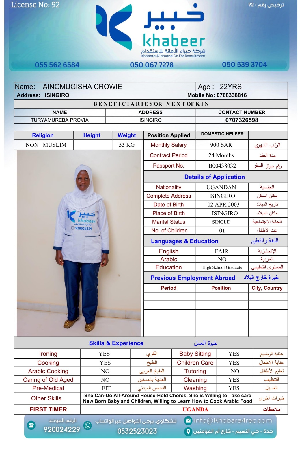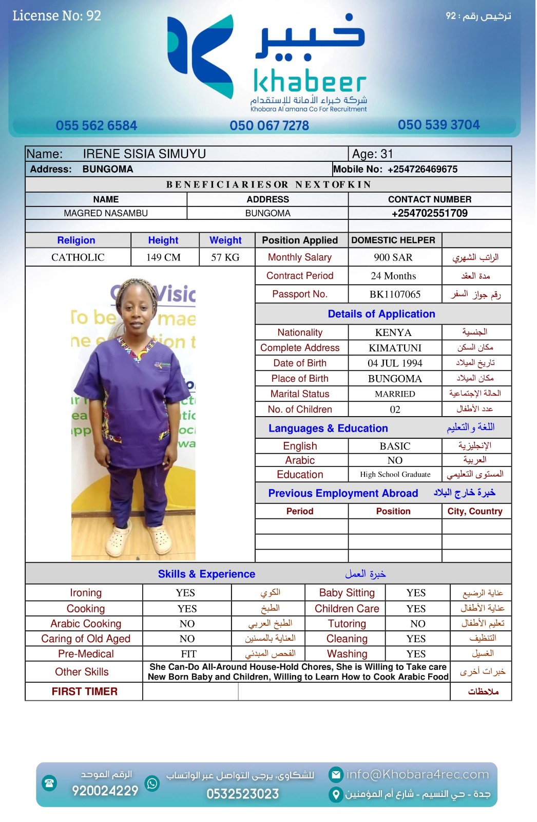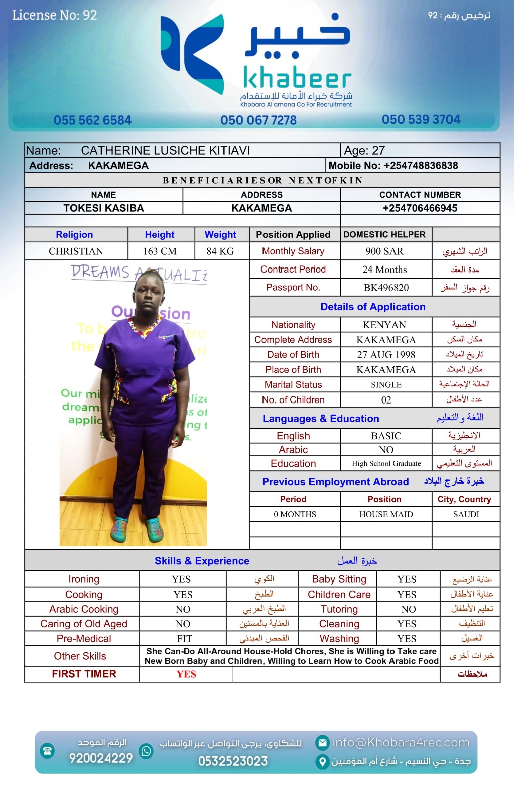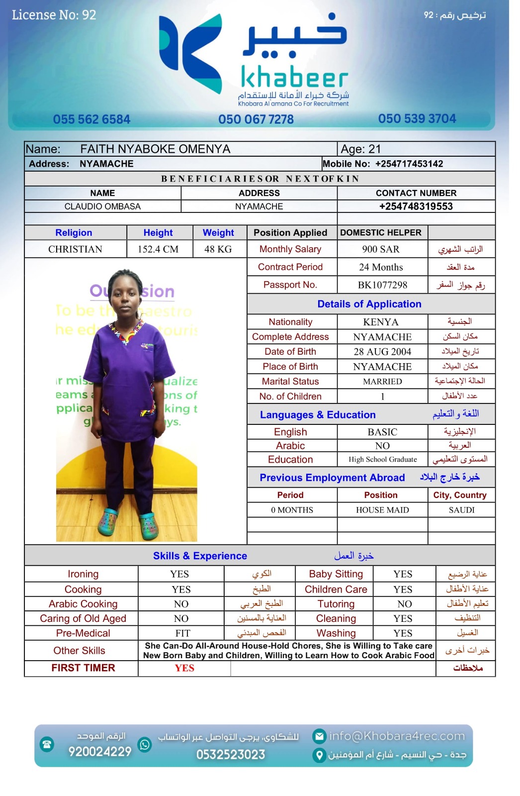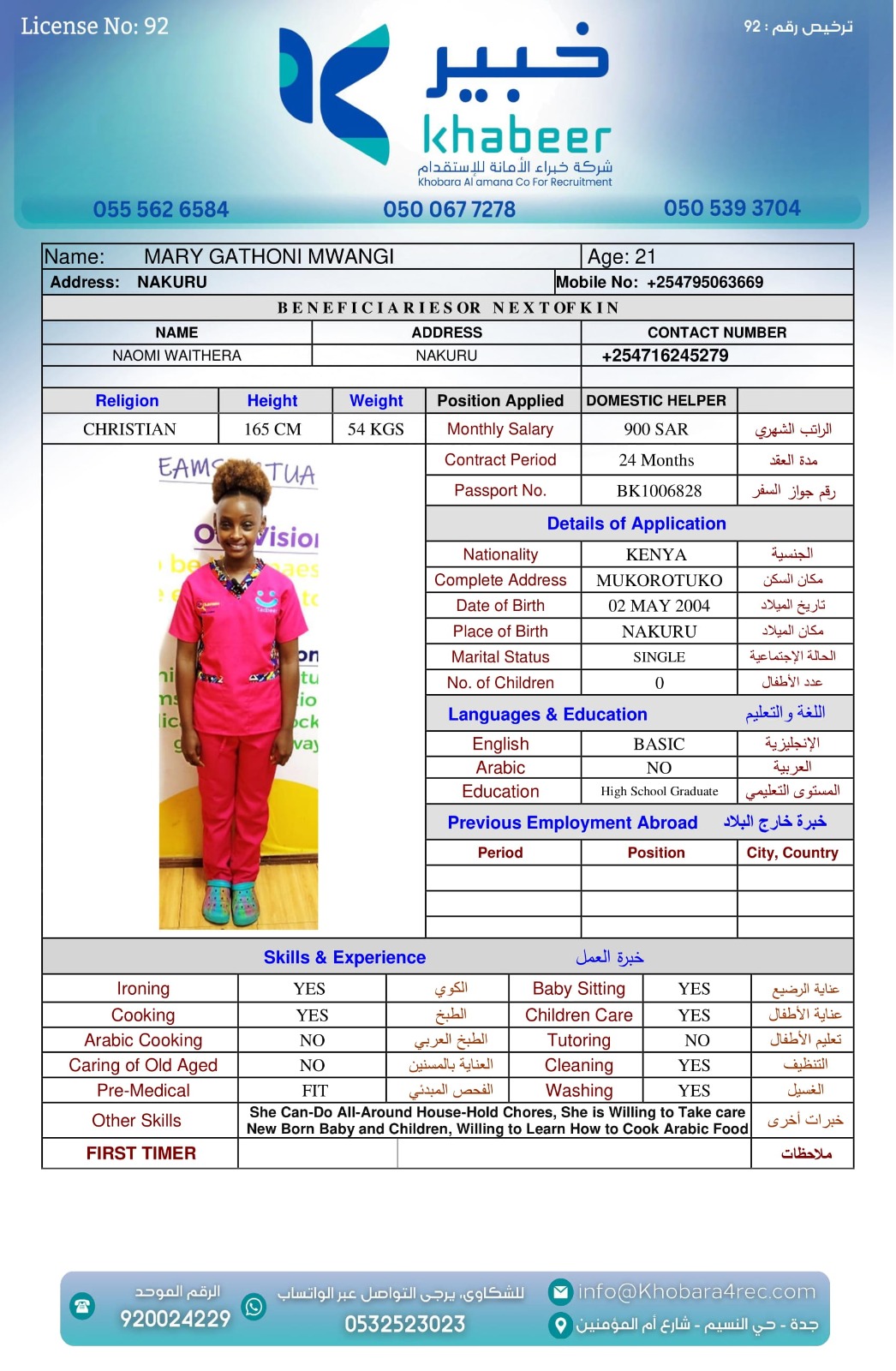 نوع الخدمة نوع الخدمة استقدام تأجير نقل خدمات الجنسية الجنسية الفلبين الهند بنغلاديش أوغندا اثيوبيا كينيا تنزانيا المهنة عاملة منزلية عاملة عناية سائق خاص الديانة مسلم غير مسلم الخبرة سبق العمل لم يسبق العمل العمر العمر 15 16 17 18 19 20 21 22 23 24 25 26 27 28 29 30 31 32 33 34 35 36 37 38 39 40 41 42 43 44 45 46 47 48 49 50 51 52 53 54 55 56 57 58 59 60 الحالة العائلية الحالة العائلية اعزب متزوج مطلق ارمل اللغة اللغة العربية العربية العربية بنجالي نبالي فلبيني امهرية سواحلي عربي + لغتها الاساسية اندونيسي اوغندي بروندي الوزن الوزن 40 41 42 43 44 45 46 47 48 49 50 51 52 53 54 55 56 57 58 59 60 61 62 63 64 65 66 67 68 69 70 71 72 73 74 75 76 77 78 79 80 81 82 83 84 85 86 87 88 89 90 91 92 93 94 95 96 97 98 99 100 الطول الطول 100 101 102 103 104 105 106 107 108 109 110 111 112 113 114 115 116 117 118 119 120 121 122 123 124 125 126 127 128 129 130 131 132 133 134 135 136 137 138 139 140 141 142 143 144 145 146 147 148 149 150 151 152 153 154 155 156 157 158 159 160 161 162 163 164 165 166 167 168 169 170 171 172 173 174 175 176 177 178 179 180 181 182 183 184 185 186 187 188 189 190 الطلبات الطلبات التنظيف الغسيل الكوي الطبيخ العربي عناية الأطفال عناية كبار السن عناية الرضيع تعليم الأطفال التنظيف - الغسيل - الكوي التنظيف - الغسيل - الكوي- رغبة في تعلم الطبخ التنظيف - الغسيل - الكوي- رغبة في العناية بالاطفال بحث مسح بحث متقدم AKABASINGURA AMINETI أوغندا العمر 33 الخبرة لم يسبق العمل الديانة غير مسلم رقم الملف B00430276 حجز العاملة AINOMUGISHA CROWIE أوغندا العمر 22 الخبرة لم يسبق العمل الديانة غير مسلم رقم الملف B00438032 حجز العاملة ACHIENG ESTHER أوغندا العمر 21 الخبرة سبق العمل الديانة غير مسلم رقم الملف B00449405 حجز العاملة MARY GATHONI MWANGI كينيا العمر 21 الخبرة لم يسبق العمل الديانة غير مسلم رقم الملف BK1006828 حجز العاملة IRENE SISIA SIMUYU كينيا العمر 31 الخبرة لم يسبق العمل الديانة غير مسلم رقم الملف BK1107065 حجز العاملة FAITH NYABOKE OMENYA كينيا العمر 21 الخبرة لم يسبق العمل الديانة غير مسلم رقم الملف BK1077298 حجز العاملة CATHERINE LUSICHE KITIAVI كينيا العمر 27 الخبرة لم يسبق العمل الديانة غير مسلم رقم الملف BK496820 حجز العاملة AGNES NJERI KURIA كينيا العمر 29 الخبرة سبق العمل الديانة غير مسلم رقم الملف AK1730813 حجز العاملة SIFA MUPA KALAMA كينيا العمر 25 الخبرة لم يسبق العمل الديانة غير مسلم رقم الملف BK1020554 حجز العاملة SERAH MWENDA CHENGO كينيا العمر 23 الخبرة سبق العمل الديانة غير مسلم رقم الملف BK1027291 حجز العاملة 2 3 4 5 6 7 8 9 10