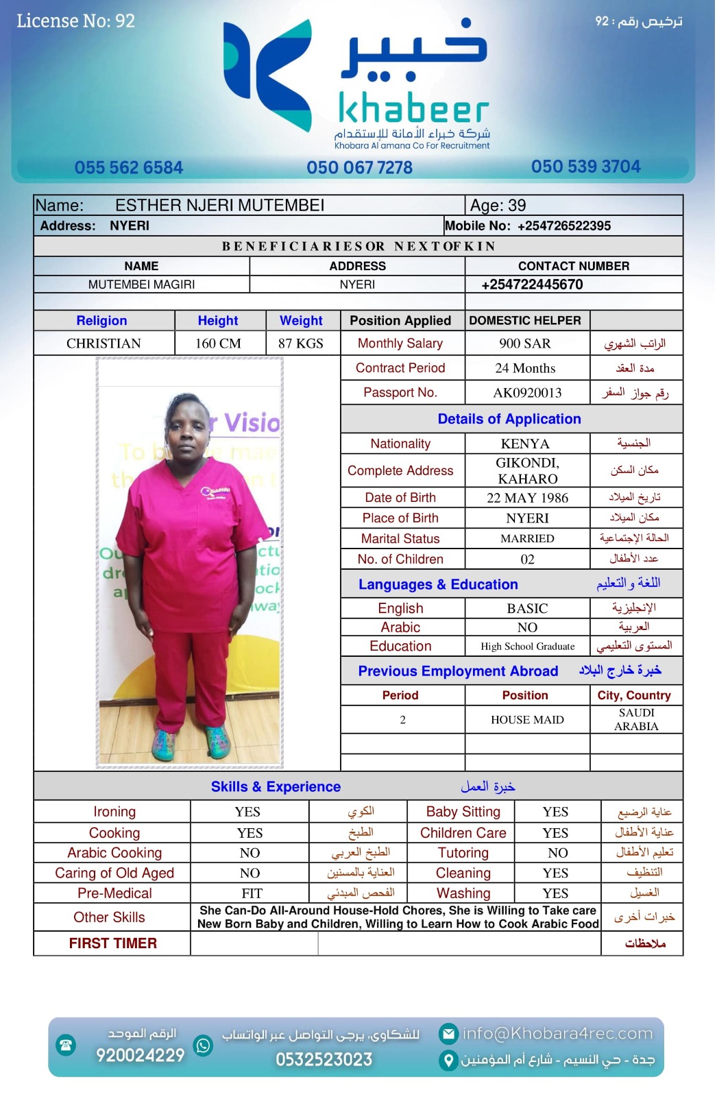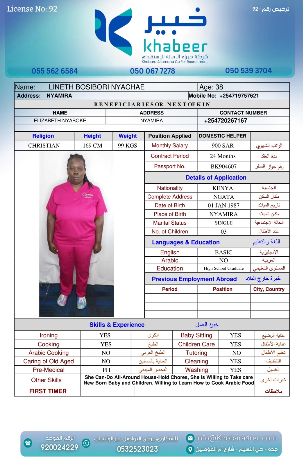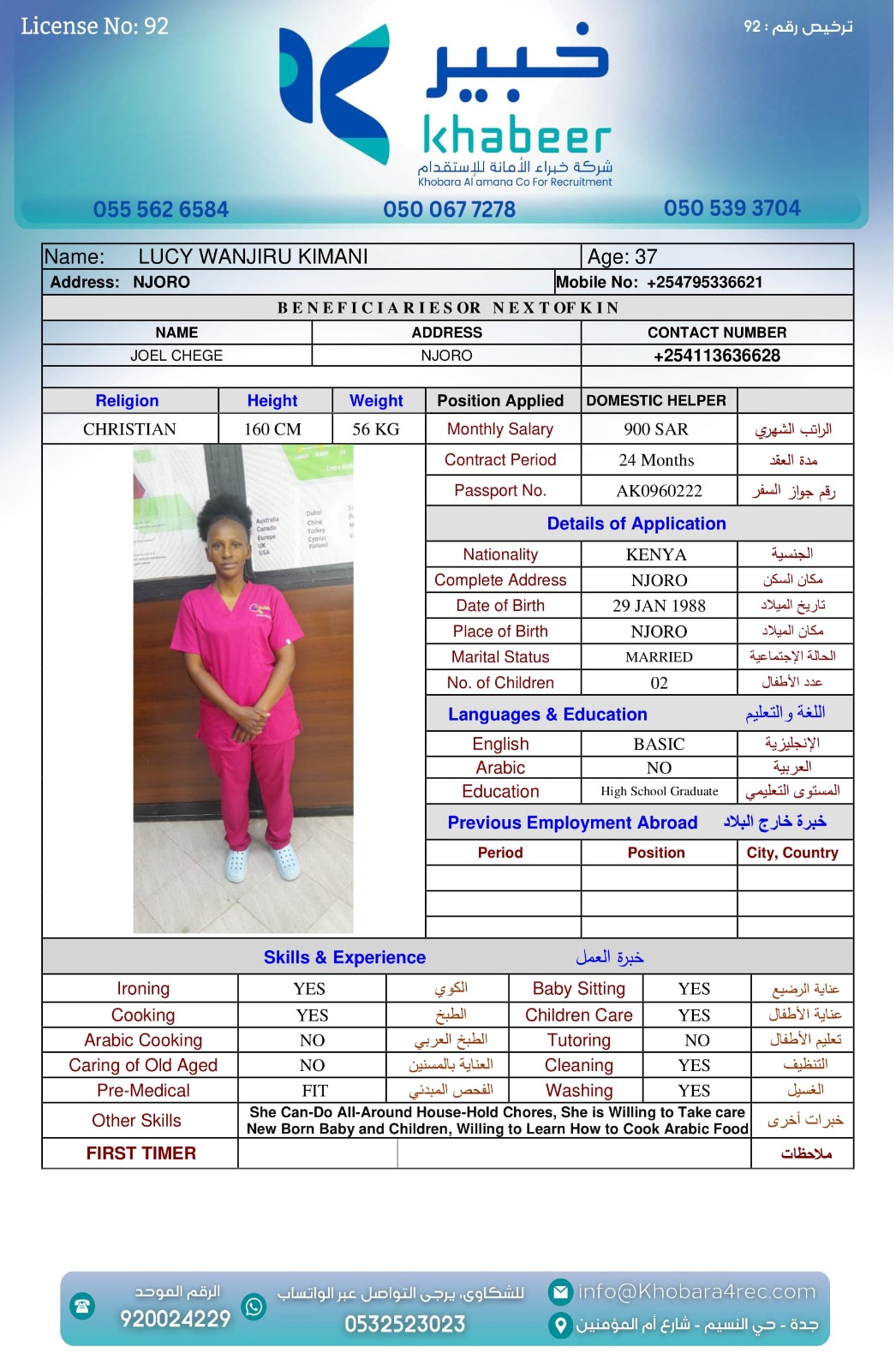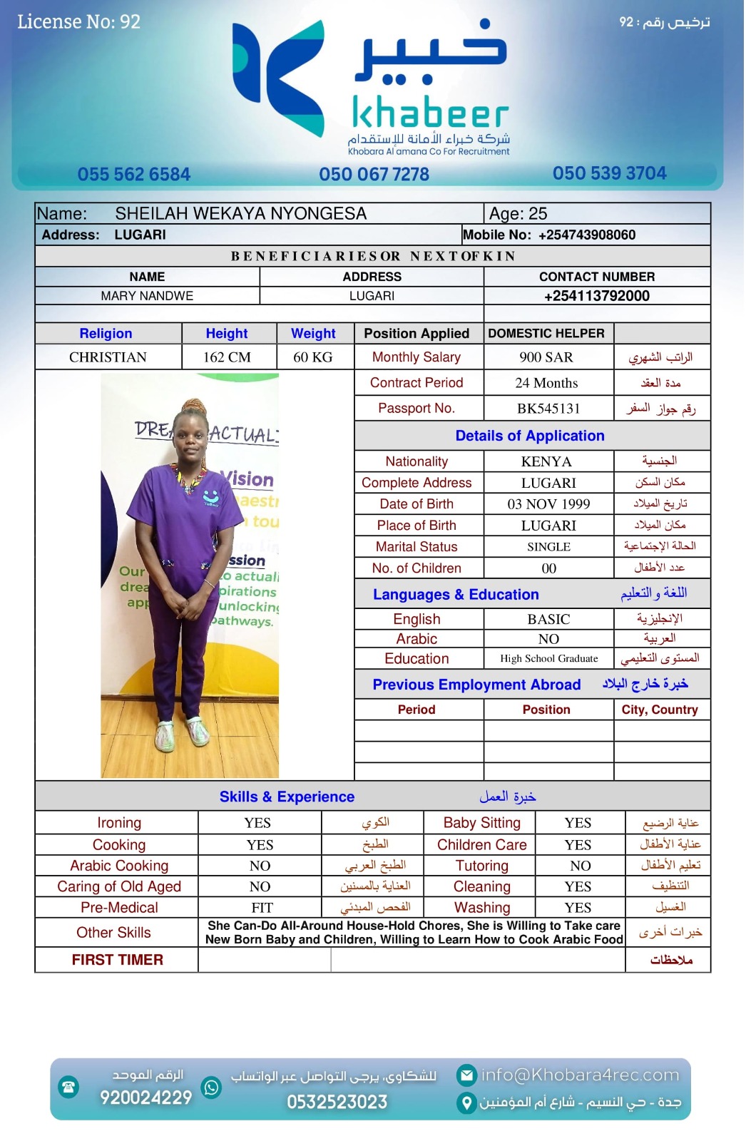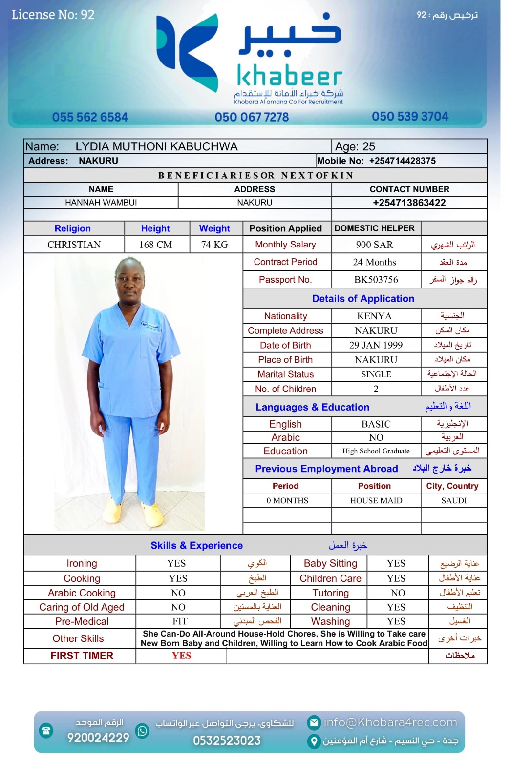 نوع الخدمة نوع الخدمة استقدام تأجير نقل خدمات الجنسية الجنسية الفلبين الهند بنغلاديش أوغندا اثيوبيا كينيا تنزانيا المهنة عاملة منزلية عاملة عناية سائق خاص الديانة مسلم غير مسلم الخبرة سبق العمل لم يسبق العمل العمر العمر 15 16 17 18 19 20 21 22 23 24 25 26 27 28 29 30 31 32 33 34 35 36 37 38 39 40 41 42 43 44 45 46 47 48 49 50 51 52 53 54 55 56 57 58 59 60 الحالة العائلية الحالة العائلية اعزب متزوج مطلق ارمل اللغة اللغة العربية العربية العربية بنجالي نبالي فلبيني امهرية سواحلي عربي + لغتها الاساسية اندونيسي اوغندي بروندي الوزن الوزن 40 41 42 43 44 45 46 47 48 49 50 51 52 53 54 55 56 57 58 59 60 61 62 63 64 65 66 67 68 69 70 71 72 73 74 75 76 77 78 79 80 81 82 83 84 85 86 87 88 89 90 91 92 93 94 95 96 97 98 99 100 الطول الطول 100 101 102 103 104 105 106 107 108 109 110 111 112 113 114 115 116 117 118 119 120 121 122 123 124 125 126 127 128 129 130 131 132 133 134 135 136 137 138 139 140 141 142 143 144 145 146 147 148 149 150 151 152 153 154 155 156 157 158 159 160 161 162 163 164 165 166 167 168 169 170 171 172 173 174 175 176 177 178 179 180 181 182 183 184 185 186 187 188 189 190 الطلبات الطلبات التنظيف الغسيل الكوي الطبيخ العربي عناية الأطفال عناية كبار السن عناية الرضيع تعليم الأطفال التنظيف - الغسيل - الكوي التنظيف - الغسيل - الكوي- رغبة في تعلم الطبخ التنظيف - الغسيل - الكوي- رغبة في العناية بالاطفال بحث مسح بحث متقدم SELPHINE NYABOKE JOEL كينيا العمر 26 الخبرة لم يسبق العمل الديانة غير مسلم رقم الملف BK1035272 حجز العاملة LYDIA MUTHONI KABUCHWA كينيا العمر 25 الخبرة لم يسبق العمل الديانة غير مسلم رقم الملف BK503756 حجز العاملة SHEILAH WEKAYA NYONGESA كينيا العمر 25 الخبرة لم يسبق العمل الديانة غير مسلم رقم الملف BK545131 حجز العاملة ROSELYNE CHARO KALUA كينيا العمر 29 الخبرة لم يسبق العمل الديانة غير مسلم رقم الملف BK955495 حجز العاملة LUCY WANJIRU KIMANI كينيا العمر 37 الخبرة لم يسبق العمل الديانة غير مسلم رقم الملف AK0960222 حجز العاملة LINETH BOSIBORI NYACHAE كينيا العمر 38 الخبرة لم يسبق العمل الديانة غير مسلم رقم الملف BK904607 حجز العاملة LILIAN MALOBA ACHONGO كينيا العمر 31 الخبرة لم يسبق العمل الديانة غير مسلم رقم الملف BK1027288 حجز العاملة JULIET SALAMA CHENGO كينيا العمر 35 الخبرة سبق العمل الديانة غير مسلم رقم الملف AK1745753 حجز العاملة HAPPINESS KWAMBOKA MORICO كينيا العمر 36 الخبرة سبق العمل الديانة غير مسلم رقم الملف BK984969 حجز العاملة ESTHER NJERI MUTEMBEI العمر 39 الخبرة سبق العمل الديانة غير مسلم رقم الملف AK0920013 حجز العاملة 3 4 5 6 7 8 9 10 11