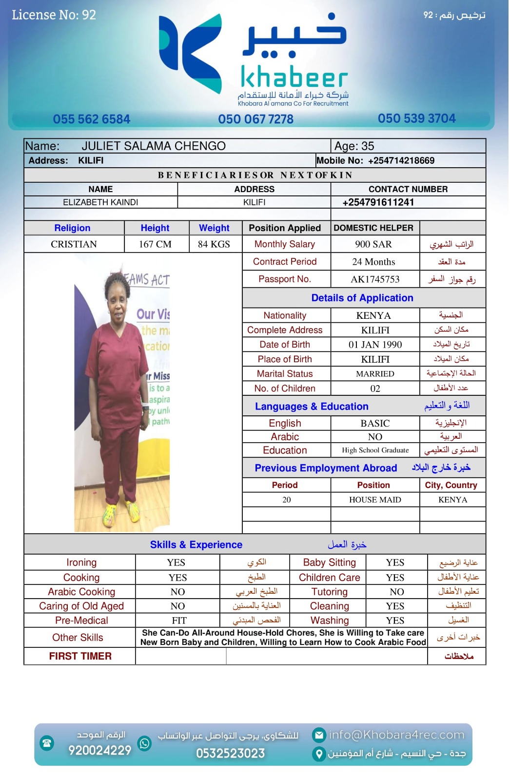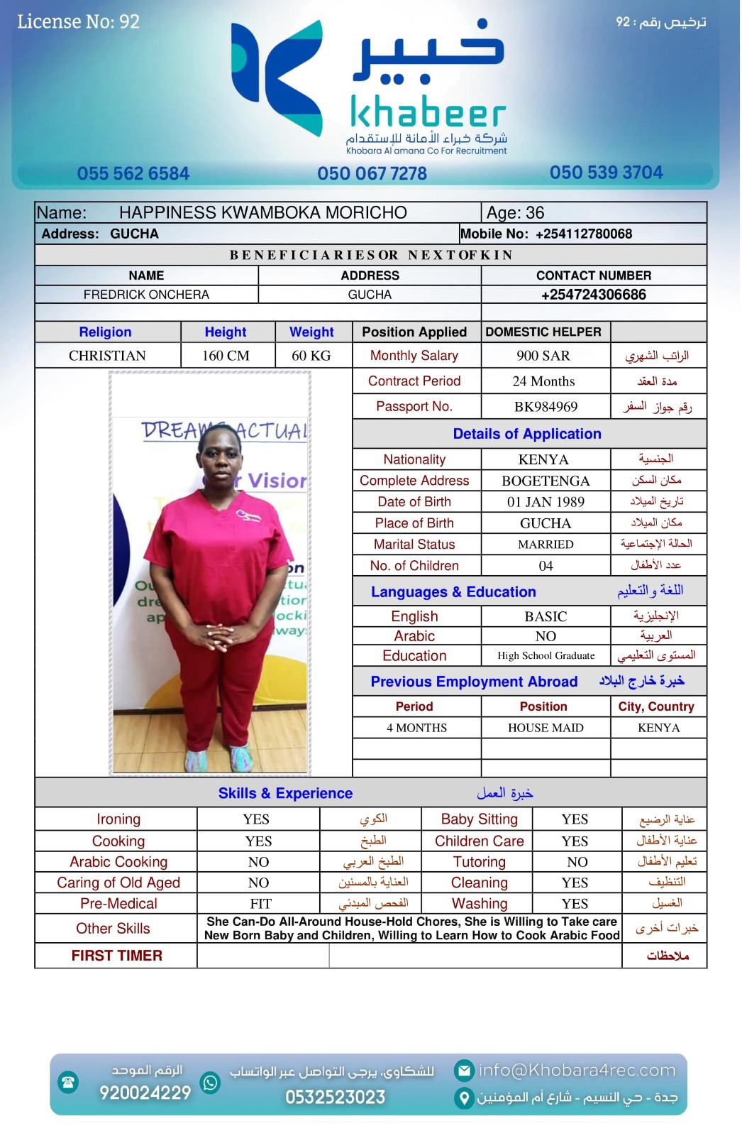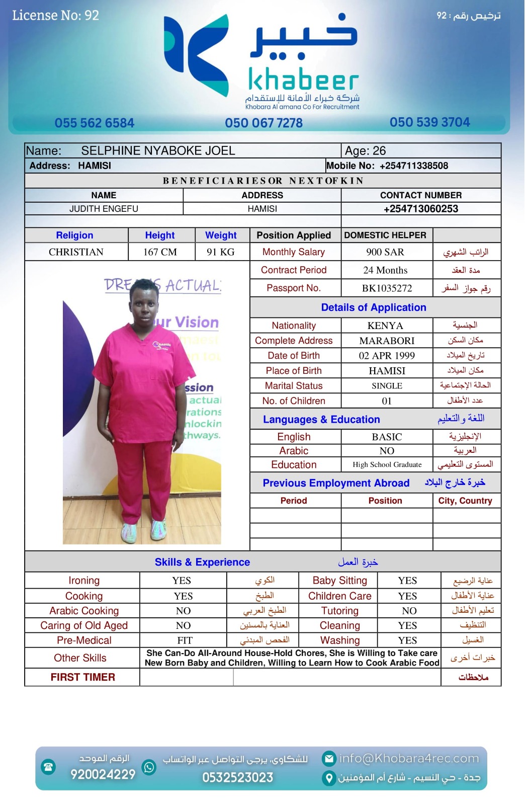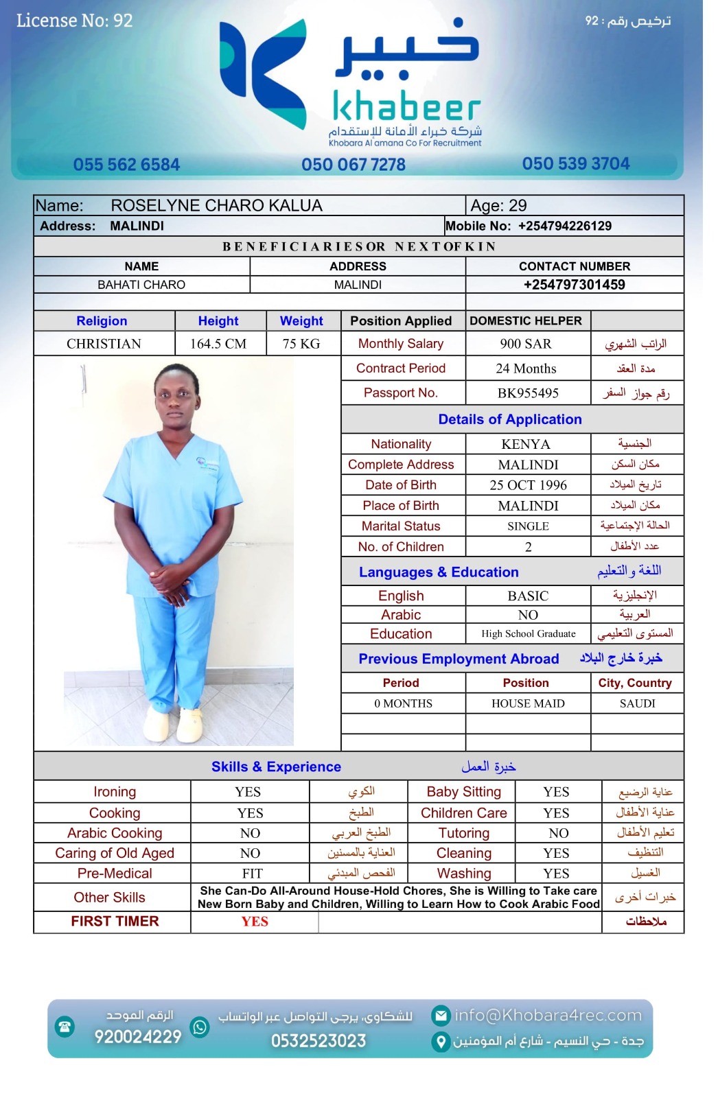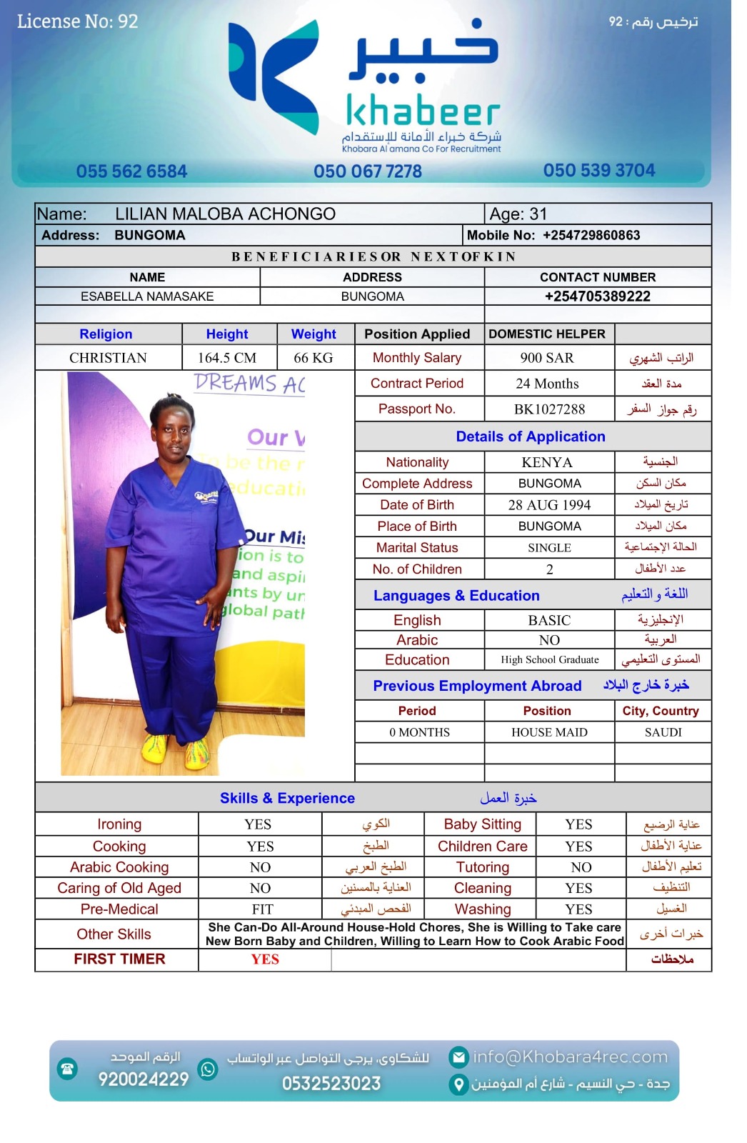 نوع الخدمة نوع الخدمة استقدام تأجير نقل خدمات الجنسية الجنسية الفلبين الهند بنغلاديش أوغندا اثيوبيا كينيا تنزانيا المهنة عاملة منزلية عاملة عناية سائق خاص الديانة مسلم غير مسلم الخبرة سبق العمل لم يسبق العمل العمر العمر 15 16 17 18 19 20 21 22 23 24 25 26 27 28 29 30 31 32 33 34 35 36 37 38 39 40 41 42 43 44 45 46 47 48 49 50 51 52 53 54 55 56 57 58 59 60 الحالة العائلية الحالة العائلية اعزب متزوج مطلق ارمل اللغة اللغة العربية العربية العربية بنجالي نبالي فلبيني امهرية سواحلي عربي + لغتها الاساسية اندونيسي اوغندي بروندي الوزن الوزن 40 41 42 43 44 45 46 47 48 49 50 51 52 53 54 55 56 57 58 59 60 61 62 63 64 65 66 67 68 69 70 71 72 73 74 75 76 77 78 79 80 81 82 83 84 85 86 87 88 89 90 91 92 93 94 95 96 97 98 99 100 الطول الطول 100 101 102 103 104 105 106 107 108 109 110 111 112 113 114 115 116 117 118 119 120 121 122 123 124 125 126 127 128 129 130 131 132 133 134 135 136 137 138 139 140 141 142 143 144 145 146 147 148 149 150 151 152 153 154 155 156 157 158 159 160 161 162 163 164 165 166 167 168 169 170 171 172 173 174 175 176 177 178 179 180 181 182 183 184 185 186 187 188 189 190 الطلبات الطلبات التنظيف الغسيل الكوي الطبيخ العربي عناية الأطفال عناية كبار السن عناية الرضيع تعليم الأطفال التنظيف - الغسيل - الكوي التنظيف - الغسيل - الكوي- رغبة في تعلم الطبخ التنظيف - الغسيل - الكوي- رغبة في العناية بالاطفال بحث مسح بحث متقدم SELPHINE NYABOKE JOEL كينيا العمر 26 الخبرة لم يسبق العمل الديانة غير مسلم رقم الملف BK1035272 حجز العاملة LYDIA MUTHONI KABUCHWA كينيا العمر 25 الخبرة لم يسبق العمل الديانة غير مسلم رقم الملف BK503756 حجز العاملة SHEILAH WEKAYA NYONGESA كينيا العمر 25 الخبرة لم يسبق العمل الديانة غير مسلم رقم الملف BK545131 حجز العاملة ROSELYNE CHARO KALUA كينيا العمر 29 الخبرة لم يسبق العمل الديانة غير مسلم رقم الملف BK955495 حجز العاملة LUCY WANJIRU KIMANI كينيا العمر 37 الخبرة لم يسبق العمل الديانة غير مسلم رقم الملف AK0960222 حجز العاملة LINETH BOSIBORI NYACHAE كينيا العمر 38 الخبرة لم يسبق العمل الديانة غير مسلم رقم الملف BK904607 حجز العاملة LILIAN MALOBA ACHONGO كينيا العمر 31 الخبرة لم يسبق العمل الديانة غير مسلم رقم الملف BK1027288 حجز العاملة JULIET SALAMA CHENGO كينيا العمر 35 الخبرة سبق العمل الديانة غير مسلم رقم الملف AK1745753 حجز العاملة HAPPINESS KWAMBOKA MORICO كينيا العمر 36 الخبرة سبق العمل الديانة غير مسلم رقم الملف BK984969 حجز العاملة ESTHER NJERI MUTEMBEI العمر 39 الخبرة سبق العمل الديانة غير مسلم رقم الملف AK0920013 حجز العاملة 3 4 5 6 7 8 9 10 11