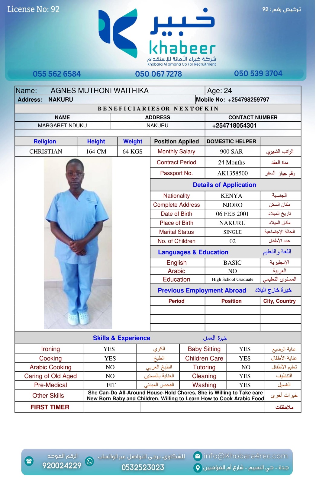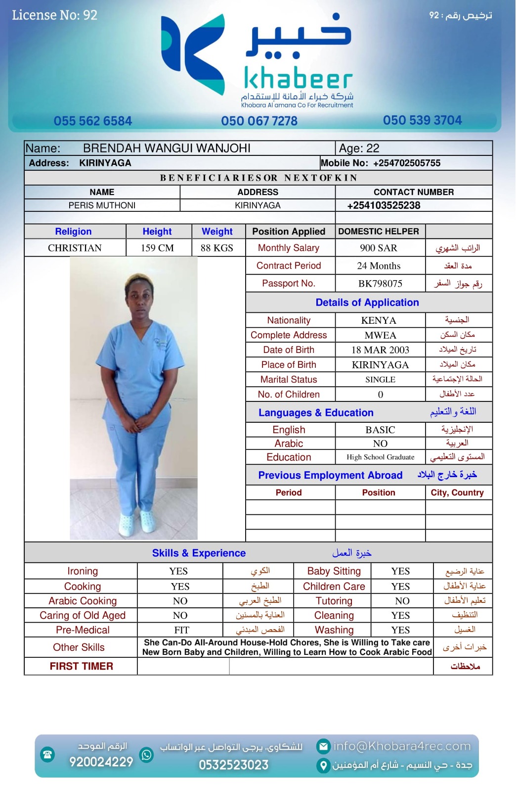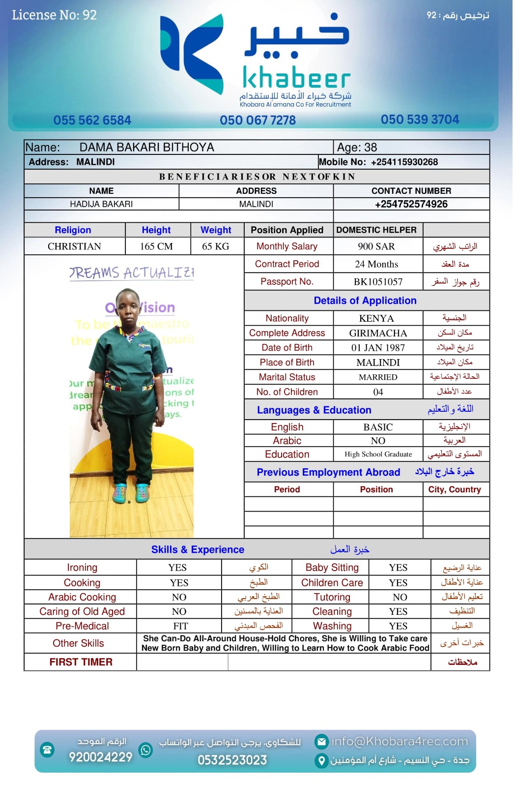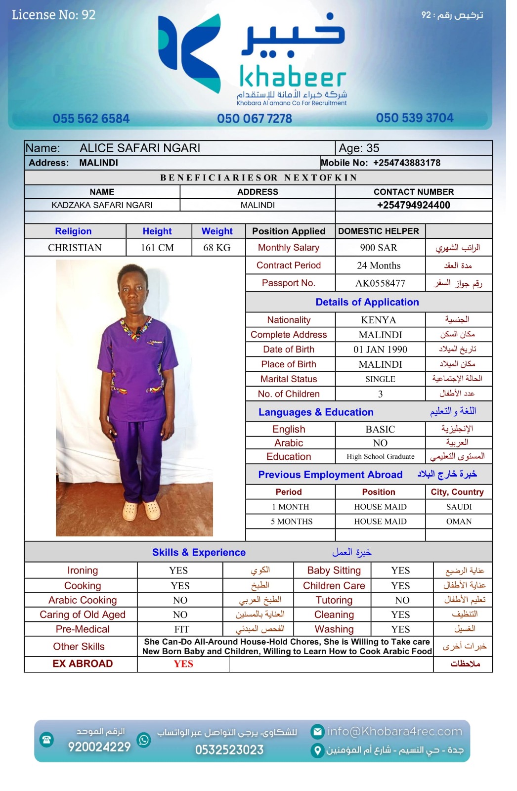 نوع الخدمة نوع الخدمة استقدام تأجير نقل خدمات الجنسية الجنسية الفلبين الهند بنغلاديش أوغندا اثيوبيا كينيا تنزانيا المهنة عاملة منزلية عاملة عناية سائق خاص الديانة مسلم غير مسلم الخبرة سبق العمل لم يسبق العمل العمر العمر 15 16 17 18 19 20 21 22 23 24 25 26 27 28 29 30 31 32 33 34 35 36 37 38 39 40 41 42 43 44 45 46 47 48 49 50 51 52 53 54 55 56 57 58 59 60 الحالة العائلية الحالة العائلية اعزب متزوج مطلق ارمل اللغة اللغة العربية العربية العربية بنجالي نبالي فلبيني امهرية سواحلي عربي + لغتها الاساسية اندونيسي اوغندي بروندي الوزن الوزن 40 41 42 43 44 45 46 47 48 49 50 51 52 53 54 55 56 57 58 59 60 61 62 63 64 65 66 67 68 69 70 71 72 73 74 75 76 77 78 79 80 81 82 83 84 85 86 87 88 89 90 91 92 93 94 95 96 97 98 99 100 الطول الطول 100 101 102 103 104 105 106 107 108 109 110 111 112 113 114 115 116 117 118 119 120 121 122 123 124 125 126 127 128 129 130 131 132 133 134 135 136 137 138 139 140 141 142 143 144 145 146 147 148 149 150 151 152 153 154 155 156 157 158 159 160 161 162 163 164 165 166 167 168 169 170 171 172 173 174 175 176 177 178 179 180 181 182 183 184 185 186 187 188 189 190 الطلبات الطلبات التنظيف الغسيل الكوي الطبيخ العربي عناية الأطفال عناية كبار السن عناية الرضيع تعليم الأطفال التنظيف - الغسيل - الكوي التنظيف - الغسيل - الكوي- رغبة في تعلم الطبخ التنظيف - الغسيل - الكوي- رغبة في العناية بالاطفال بحث مسح بحث متقدم DAMA BAKARI BITHOYA كينيا العمر 38 الخبرة لم يسبق العمل الديانة غير مسلم رقم الملف BK1051057 حجز العاملة BRENDAH WANGUI WANJOHI كينيا العمر 22 الخبرة لم يسبق العمل الديانة غير مسلم رقم الملف BK798075 حجز العاملة ALICE SAFARI NGARI كينيا العمر 35 الخبرة سبق العمل الديانة غير مسلم رقم الملف AK0558477 حجز العاملة TANJINA بنغلاديش العمر 29 الخبرة لم يسبق العمل الديانة مسلم رقم الملف A19525763 حجز العاملة AGNES MUTHONI WAITHIKA كينيا العمر 24 الخبرة لم يسبق العمل الديانة غير مسلم رقم الملف AK1358500 حجز العاملة SHEENA MAE LUPANGO LEMI الفلبين العمر 24 الخبرة لم يسبق العمل الديانة غير مسلم رقم الملف P9940646C حجز العاملة JANET ABONITA الفلبين العمر 34 الخبرة سبق العمل الديانة غير مسلم رقم الملف P8816065C حجز العاملة MST SALENA BAUN بنغلاديش العمر 41 الخبرة سبق العمل الديانة مسلم رقم الملف EK0630847 حجز العاملة SUKTARA BEGUM بنغلاديش العمر 31 الخبرة لم يسبق العمل الديانة مسلم رقم الملف A17855337 حجز العاملة MAHAMUDA بنغلاديش العمر 33 الخبرة لم يسبق العمل الديانة مسلم رقم الملف A18499583 حجز العاملة 4 5 6 7 8 9 10 11
