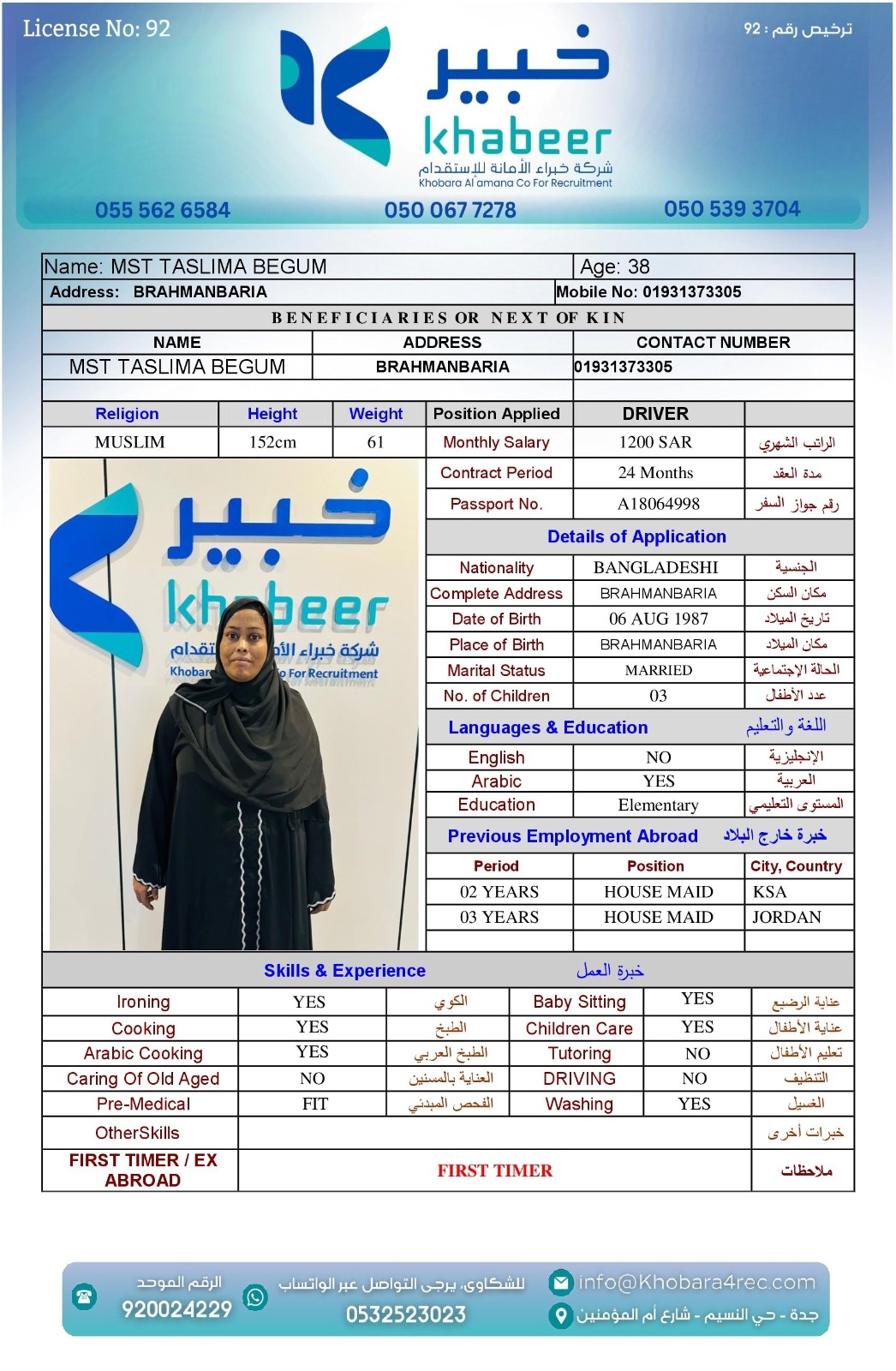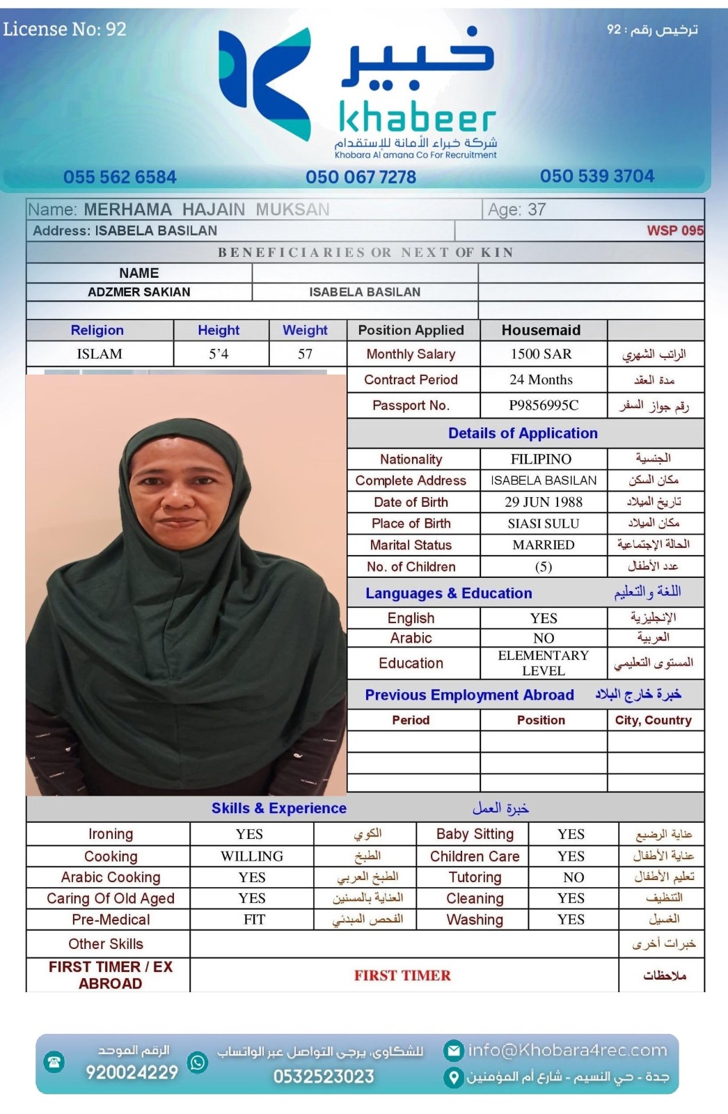 نوع الخدمة نوع الخدمة استقدام تأجير نقل خدمات الجنسية الجنسية الفلبين الهند بنغلاديش أوغندا اثيوبيا كينيا تنزانيا المهنة عاملة منزلية عاملة عناية سائق خاص الديانة مسلم غير مسلم الخبرة سبق العمل لم يسبق العمل العمر العمر 15 16 17 18 19 20 21 22 23 24 25 26 27 28 29 30 31 32 33 34 35 36 37 38 39 40 41 42 43 44 45 46 47 48 49 50 51 52 53 54 55 56 57 58 59 60 الحالة العائلية الحالة العائلية اعزب متزوج مطلق ارمل اللغة اللغة العربية العربية العربية بنجالي نبالي فلبيني امهرية سواحلي عربي + لغتها الاساسية اندونيسي اوغندي بروندي الوزن الوزن 40 41 42 43 44 45 46 47 48 49 50 51 52 53 54 55 56 57 58 59 60 61 62 63 64 65 66 67 68 69 70 71 72 73 74 75 76 77 78 79 80 81 82 83 84 85 86 87 88 89 90 91 92 93 94 95 96 97 98 99 100 الطول الطول 100 101 102 103 104 105 106 107 108 109 110 111 112 113 114 115 116 117 118 119 120 121 122 123 124 125 126 127 128 129 130 131 132 133 134 135 136 137 138 139 140 141 142 143 144 145 146 147 148 149 150 151 152 153 154 155 156 157 158 159 160 161 162 163 164 165 166 167 168 169 170 171 172 173 174 175 176 177 178 179 180 181 182 183 184 185 186 187 188 189 190 الطلبات الطلبات التنظيف الغسيل الكوي الطبيخ العربي عناية الأطفال عناية كبار السن عناية الرضيع تعليم الأطفال التنظيف - الغسيل - الكوي التنظيف - الغسيل - الكوي- رغبة في تعلم الطبخ التنظيف - الغسيل - الكوي- رغبة في العناية بالاطفال بحث مسح بحث متقدم MERHAMA HAJAIN MUKSAN الفلبين العمر 37 الخبرة لم يسبق العمل الديانة مسلم رقم الملف P9856995C حجز العاملة MST TASLIMA BEGUM بنغلاديش العمر 38 الخبرة سبق العمل الديانة مسلم رقم الملف A18064998 حجز العاملة