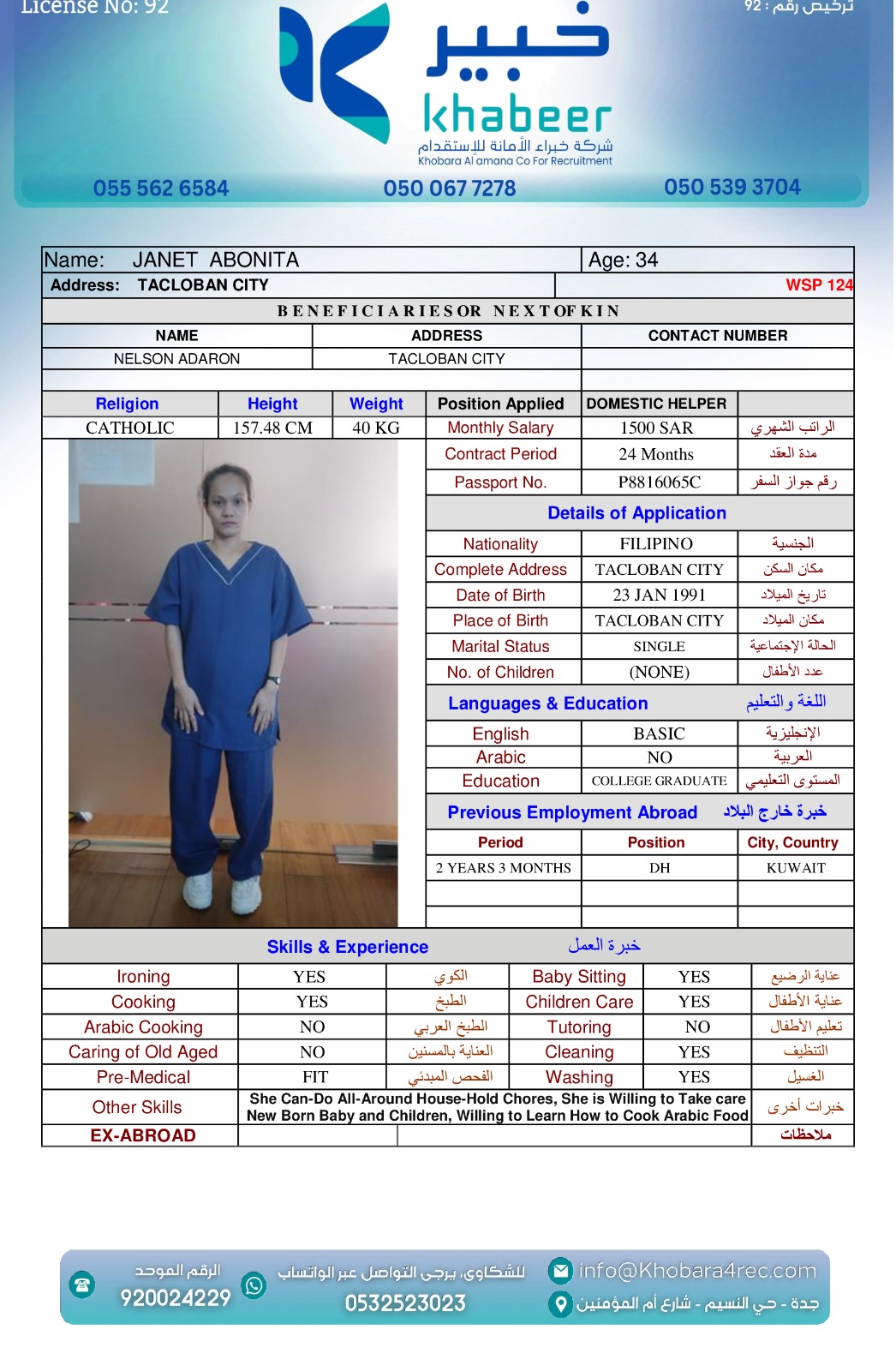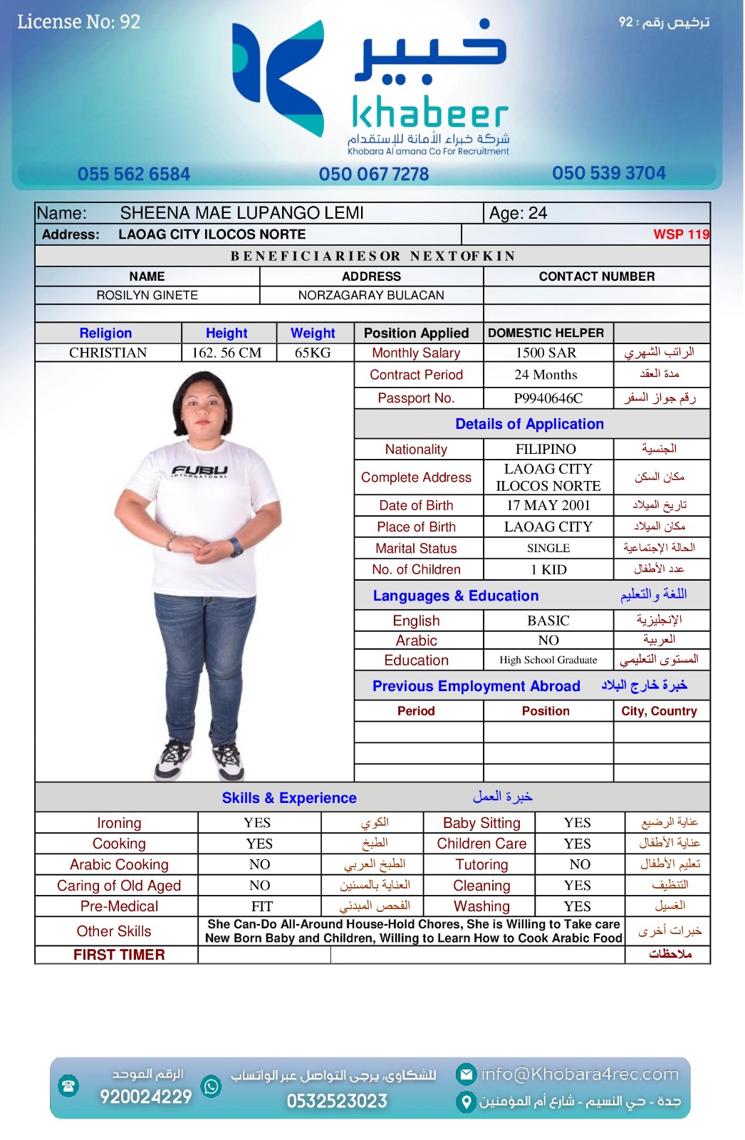 نوع الخدمة نوع الخدمة استقدام تأجير نقل خدمات الجنسية الجنسية الفلبين الهند بنغلاديش أوغندا اثيوبيا كينيا تنزانيا المهنة عاملة منزلية عاملة عناية سائق خاص الديانة مسلم غير مسلم الخبرة سبق العمل لم يسبق العمل العمر العمر 15 16 17 18 19 20 21 22 23 24 25 26 27 28 29 30 31 32 33 34 35 36 37 38 39 40 41 42 43 44 45 46 47 48 49 50 51 52 53 54 55 56 57 58 59 60 الحالة العائلية الحالة العائلية اعزب متزوج مطلق ارمل اللغة اللغة العربية العربية العربية بنجالي نبالي فلبيني امهرية سواحلي عربي + لغتها الاساسية اندونيسي اوغندي بروندي الوزن الوزن 40 41 42 43 44 45 46 47 48 49 50 51 52 53 54 55 56 57 58 59 60 61 62 63 64 65 66 67 68 69 70 71 72 73 74 75 76 77 78 79 80 81 82 83 84 85 86 87 88 89 90 91 92 93 94 95 96 97 98 99 100 الطول الطول 100 101 102 103 104 105 106 107 108 109 110 111 112 113 114 115 116 117 118 119 120 121 122 123 124 125 126 127 128 129 130 131 132 133 134 135 136 137 138 139 140 141 142 143 144 145 146 147 148 149 150 151 152 153 154 155 156 157 158 159 160 161 162 163 164 165 166 167 168 169 170 171 172 173 174 175 176 177 178 179 180 181 182 183 184 185 186 187 188 189 190 الطلبات الطلبات التنظيف الغسيل الكوي الطبيخ العربي عناية الأطفال عناية كبار السن عناية الرضيع تعليم الأطفال التنظيف - الغسيل - الكوي التنظيف - الغسيل - الكوي- رغبة في تعلم الطبخ التنظيف - الغسيل - الكوي- رغبة في العناية بالاطفال بحث مسح بحث متقدم MERHAMA HAJAIN MUKSAN الفلبين العمر 37 الخبرة لم يسبق العمل الديانة مسلم رقم الملف P9856995C حجز العاملة SHEENA MAE LUPANGO LEMI الفلبين العمر 24 الخبرة لم يسبق العمل الديانة غير مسلم رقم الملف P9940646C حجز العاملة JANET ABONITA الفلبين العمر 34 الخبرة سبق العمل الديانة غير مسلم رقم الملف P8816065C حجز العاملة