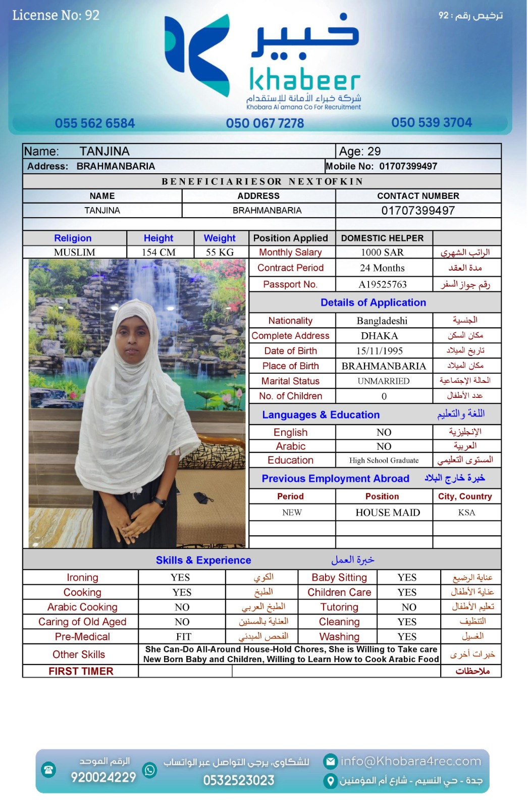 نوع الخدمة نوع الخدمة استقدام تأجير نقل خدمات الجنسية الجنسية الفلبين الهند بنغلاديش أوغندا اثيوبيا كينيا تنزانيا المهنة عاملة منزلية عاملة عناية سائق خاص الديانة مسلم غير مسلم الخبرة سبق العمل لم يسبق العمل العمر العمر 15 16 17 18 19 20 21 22 23 24 25 26 27 28 29 30 31 32 33 34 35 36 37 38 39 40 41 42 43 44 45 46 47 48 49 50 51 52 53 54 55 56 57 58 59 60 الحالة العائلية الحالة العائلية اعزب متزوج مطلق ارمل اللغة اللغة العربية العربية العربية بنجالي نبالي فلبيني امهرية سواحلي عربي + لغتها الاساسية اندونيسي اوغندي بروندي الوزن الوزن 40 41 42 43 44 45 46 47 48 49 50 51 52 53 54 55 56 57 58 59 60 61 62 63 64 65 66 67 68 69 70 71 72 73 74 75 76 77 78 79 80 81 82 83 84 85 86 87 88 89 90 91 92 93 94 95 96 97 98 99 100 الطول الطول 100 101 102 103 104 105 106 107 108 109 110 111 112 113 114 115 116 117 118 119 120 121 122 123 124 125 126 127 128 129 130 131 132 133 134 135 136 137 138 139 140 141 142 143 144 145 146 147 148 149 150 151 152 153 154 155 156 157 158 159 160 161 162 163 164 165 166 167 168 169 170 171 172 173 174 175 176 177 178 179 180 181 182 183 184 185 186 187 188 189 190 الطلبات الطلبات التنظيف الغسيل الكوي الطبيخ العربي عناية الأطفال عناية كبار السن عناية الرضيع تعليم الأطفال التنظيف - الغسيل - الكوي التنظيف - الغسيل - الكوي- رغبة في تعلم الطبخ التنظيف - الغسيل - الكوي- رغبة في العناية بالاطفال بحث مسح بحث متقدم TANJINA بنغلاديش العمر 29 الخبرة لم يسبق العمل الديانة مسلم رقم الملف A19525763 حجز العاملة MST TASLIMA BEGUM بنغلاديش العمر 38 الخبرة سبق العمل الديانة مسلم رقم الملف A18064998 حجز العاملة MST SALENA BAUN بنغلاديش العمر 41 الخبرة سبق العمل الديانة مسلم رقم الملف EK0630847 حجز العاملة SUKTARA BEGUM بنغلاديش العمر 31 الخبرة لم يسبق العمل الديانة مسلم رقم الملف A17855337 حجز العاملة MAHAMUDA بنغلاديش العمر 33 الخبرة لم يسبق العمل الديانة مسلم رقم الملف A18499583 حجز العاملة MOMTAJ BEGUM بنغلاديش العمر 43 الخبرة سبق العمل الديانة مسلم رقم الملف A17599180 حجز العاملة SALMA بنغلاديش العمر 36 الخبرة سبق العمل الديانة مسلم رقم الملف A05103320 حجز العاملة SAIARA AKTER بنغلاديش العمر 26 الخبرة لم يسبق العمل الديانة مسلم رقم الملف A18656980 حجز العاملة
